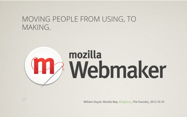 A presentation about Mozilla Webmaker given at Digibury in 2012. The deck focuses on what Mozilla are doing to help move people from web consumption to web making.