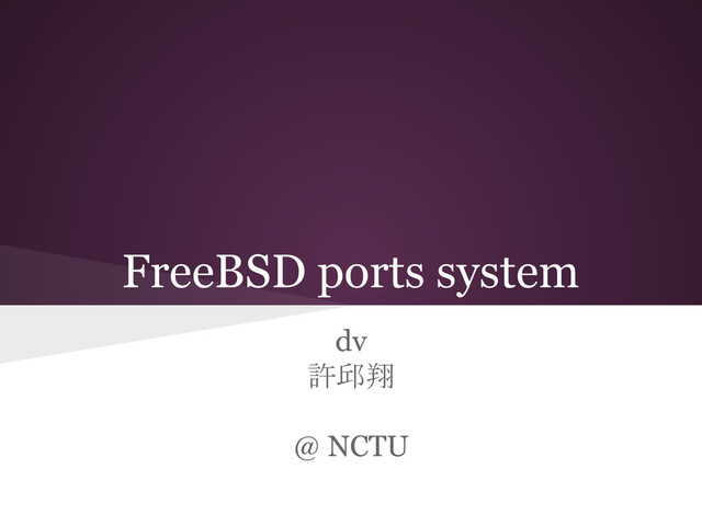 ports tree (cont'd) • distfiles/ 預設會把安裝軟體時所需要下載的檔案 存到 /usr/ports/distfiles/ 底下