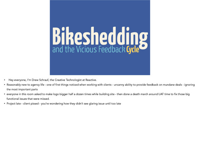 Drew Schrauf, the Creative Technologist at Reactive. • Reasonably new to agency life - one of first things noticed when working with clients - uncanny ability to provide feedback on mundane deals - ignoring the most important parts • everyone in this room asked to make logo bigger half a dozen times while building site - then done a death march around UAT time to fix those big functional issues that were missed. • Project late - client pissed - you’re wondering how they didn’t see glaring issue until too late