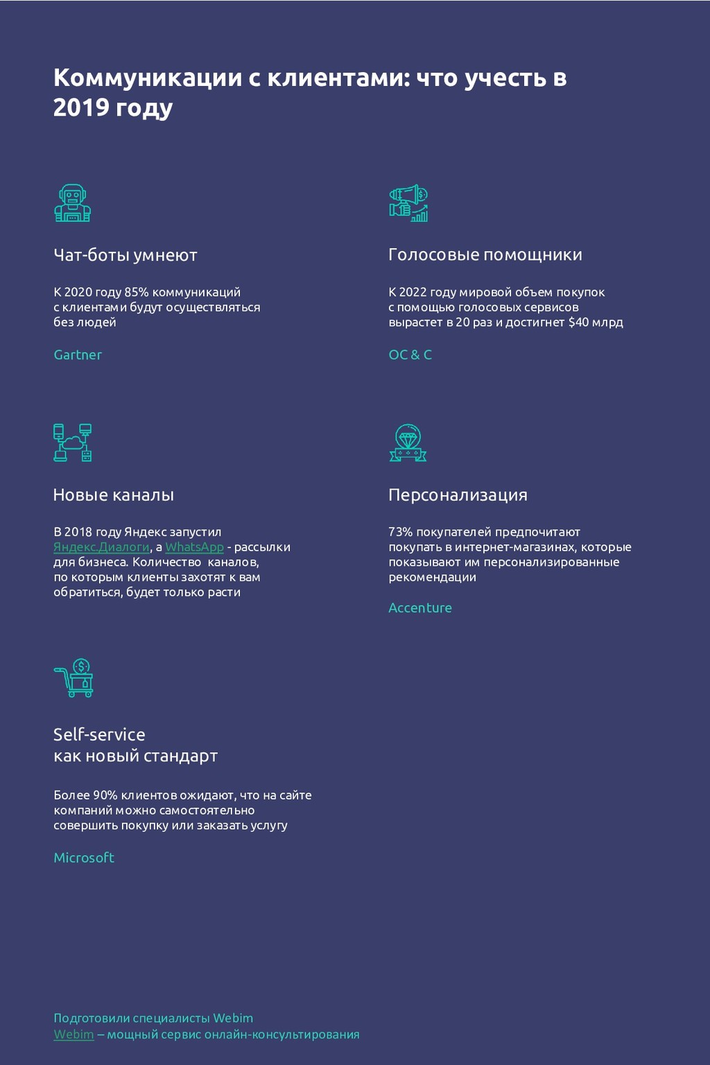 Голосовые помощники Новые каналы Персонализацияя Self-service как новый стандарт Более 90% клиентов ожидают, что на сайте компаний можно самостоятельно совершить покупку или заказать услугу Microsoft К 2020 году 85% коммуникаций с клиентами будут осуществляться без людей Gartner В 2018 году Яндекс запустил Яндекс.Диалоги, а WhatsApp - рассылки для бизнеса. Количество каналов, по которым клиенты захотят к вам обратиться, будет только расти Подготовили специалисты Webim Webim – мощный сервис онлайн-консультирования 73% покупателей предпочитают покупать в интернет-магазинах, которые показывают им персонализированные рекомендации Accenture К 2022 году мировой объем покупок с помощью голосовых сервисов вырастет в 20 раз и достигнет $40 млрд OC & C