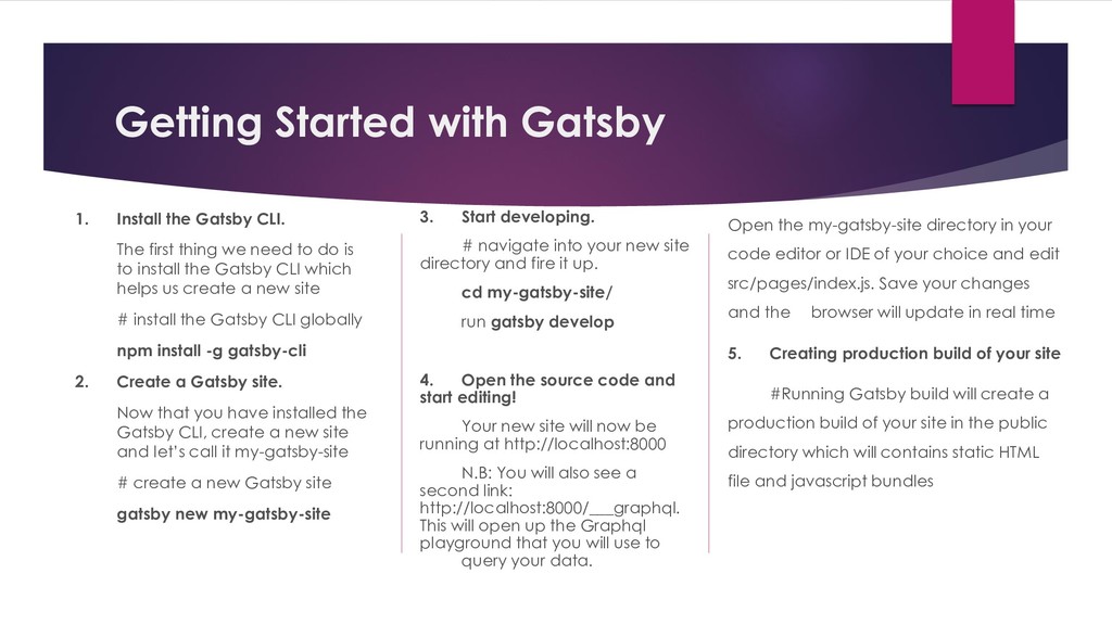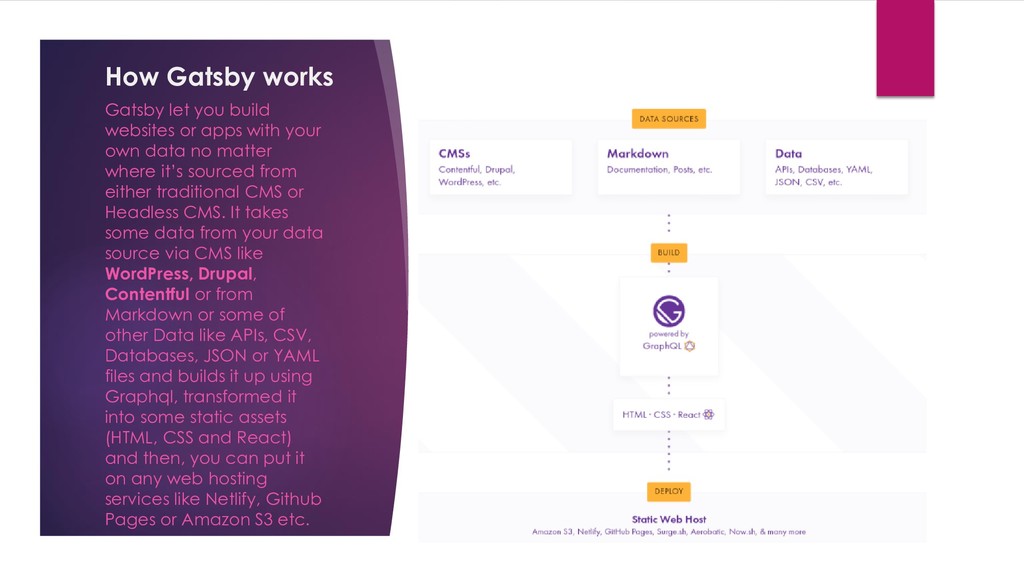 Gastby is a static site generator that is built on React which uses Graphql to allow you to query your data in whatever way you want and also webpack to bundle your code into fewer assets. Its setup with CSS modules which makes it dope but if you have another way to handle your styling, it is very easy to change it or might decide use other templates. All of this is built together using webpack.