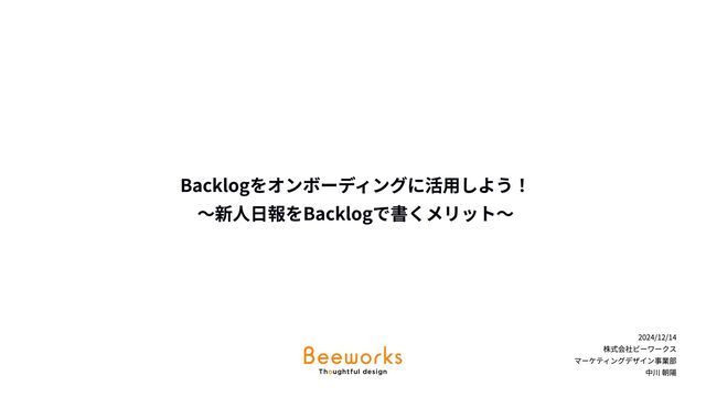 Backlogをオンボーディングに活用しよう! 〜新人日報をBacklogで書くメリット〜 2024/12/14 株式会社ビーワークス マーケティングデザイン事業部 中川 朝陽