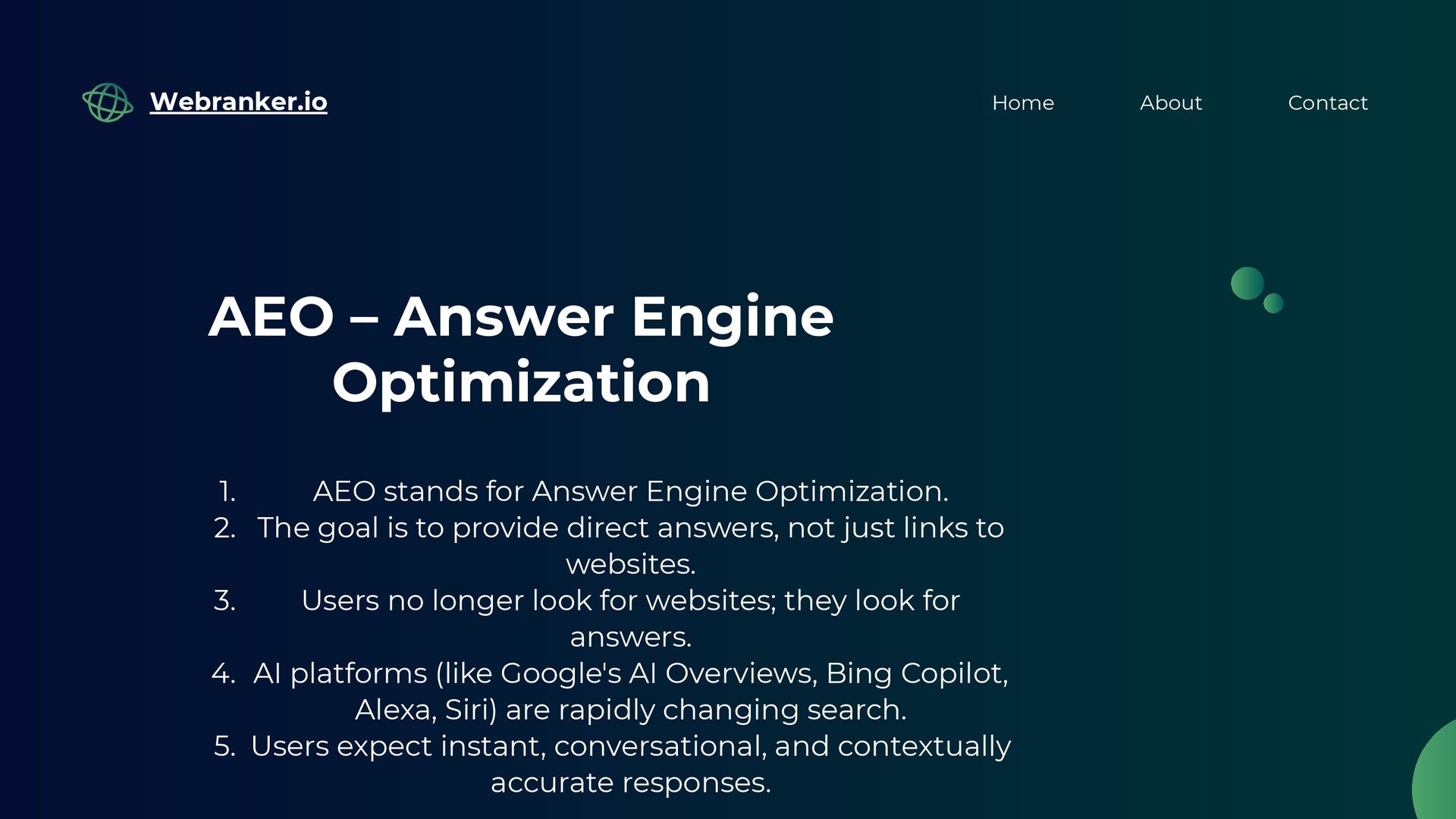AEO stands for Answer Engine Optimization. 2. The goal is to provide direct answers, not just links to websites. 3. Users no longer look for websites; they look for answers. 4. AI platforms (like Google's AI Overviews, Bing Copilot, Alexa, Siri) are rapidly changing search. 5. Users expect instant, conversational, and contextually accurate responses.