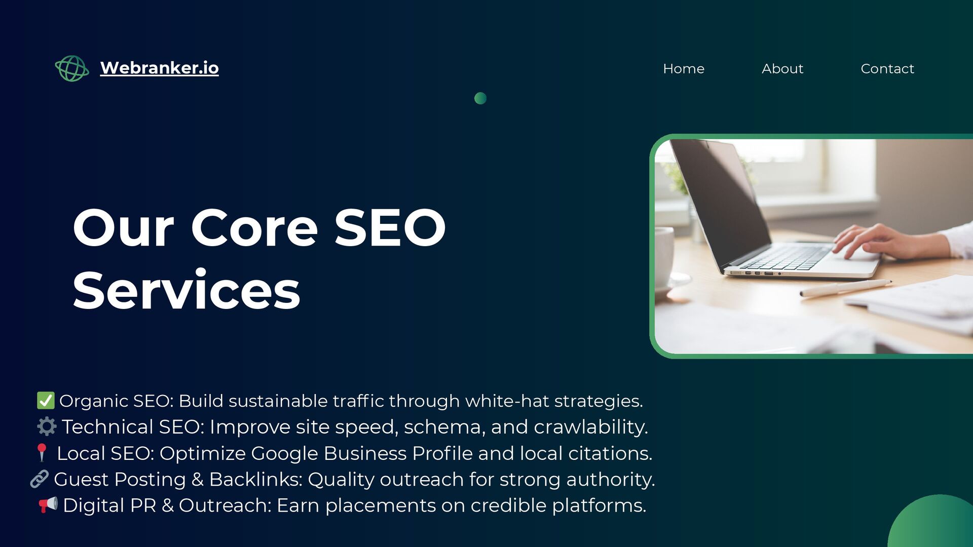 SEO: Build sustainable traffic through white-hat strategies. ⚙️ Technical SEO: Improve site speed, schema, and crawlability. 📍 Local SEO: Optimize Google Business Profile and local citations. 🔗 Guest Posting & Backlinks: Quality outreach for strong authority. 📢 Digital PR & Outreach: Earn placements on credible platforms.