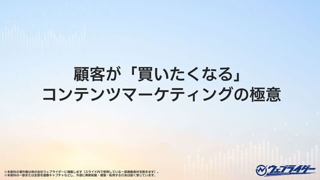 株式会社ウェブライダー(https://web-rider.jp/)代表の松尾茂起が、顧客が「買いたくなる」コンテンツマーケティング戦略について語ります。ビジネスにおける成果を「顧客が成りたい姿になった結果(=成果)」から支払われる対価と捉え、顧客の「Being」に軸足を置いた訴求を提案します。また、顧客に共感するのではなく、顧客に共感してもらうための「シンパシー」の大切さについても語ります。