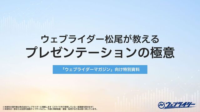 株式会社ウェブライダー( https://web-rider.jp/ )代表の松尾 茂起が教える、聴き手を魅了し、行動を促すプレゼンテーションのノウハウです。 このスライドは以下の記事と連動しています。