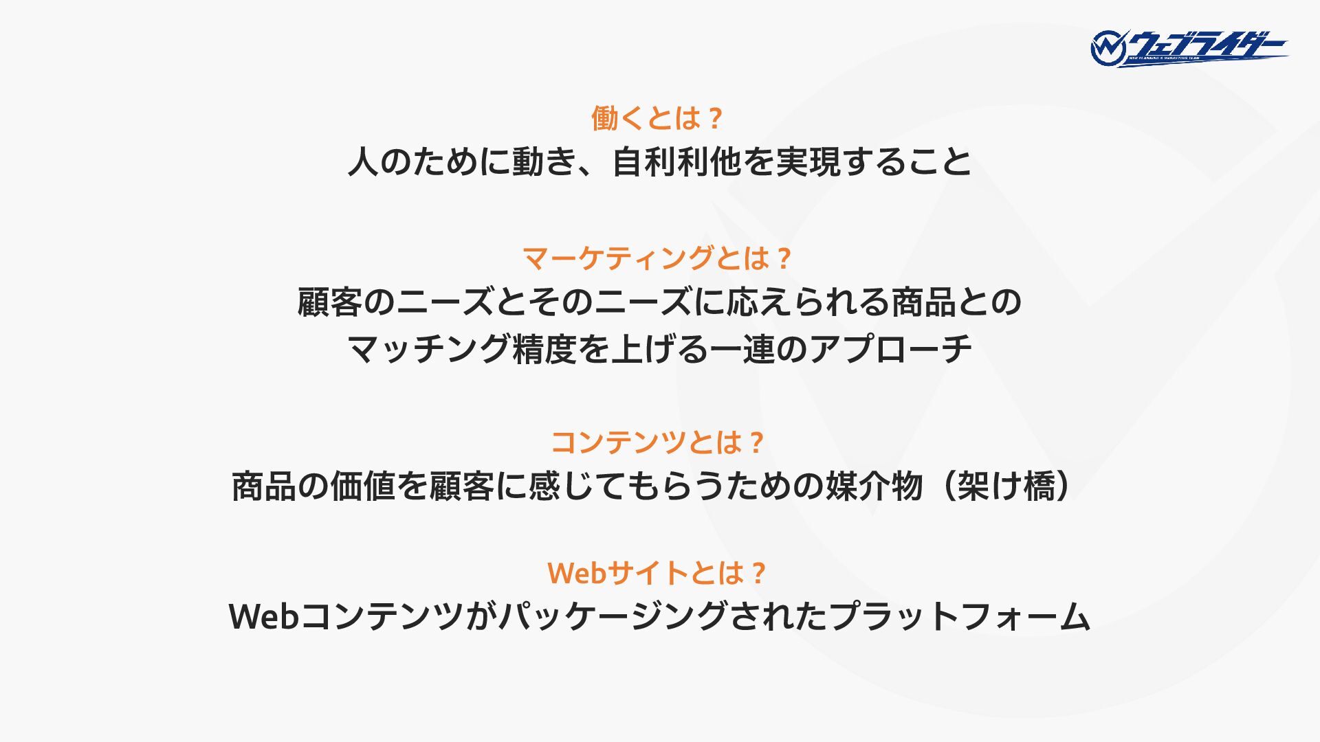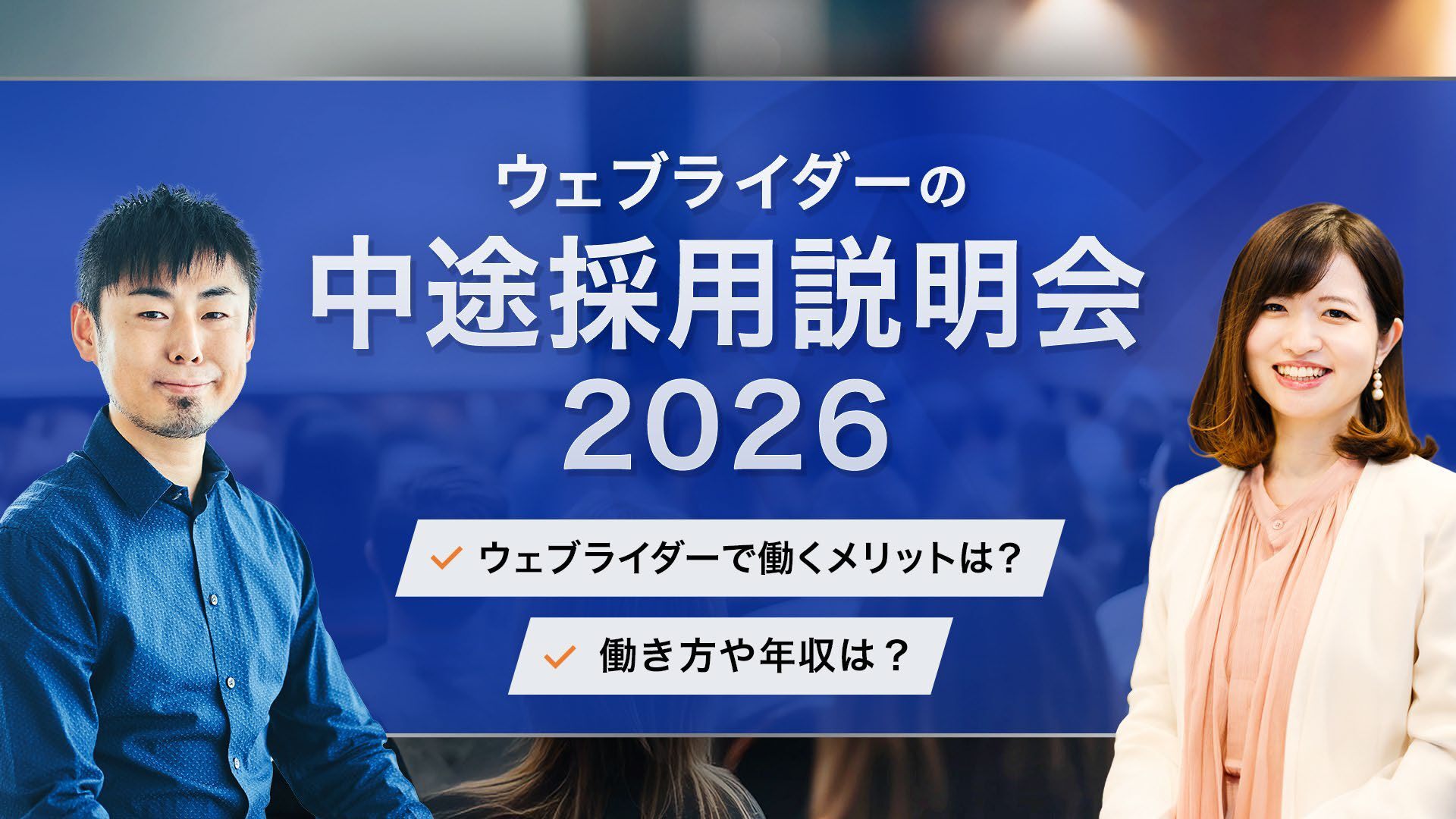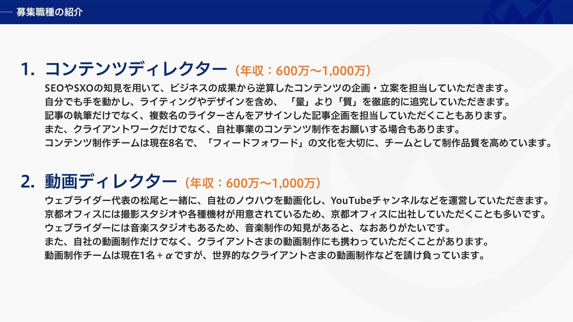 株式会社ウェブライダーのオンライン動画「中途採用説明会 2026」で用いたスライド資料です。 ウェブライダーでは、記事編集者・コンテンツディレクター・動画ディレクター・動画編集者を募集しています。