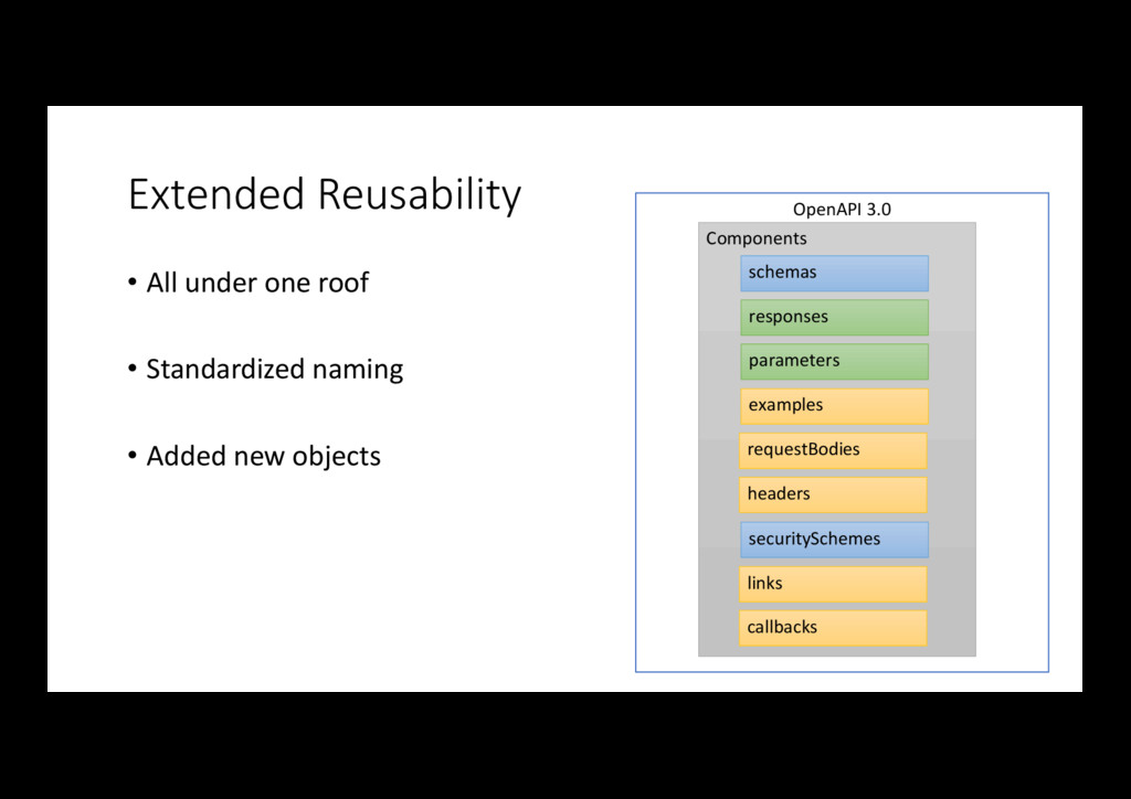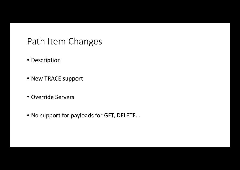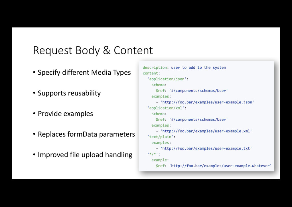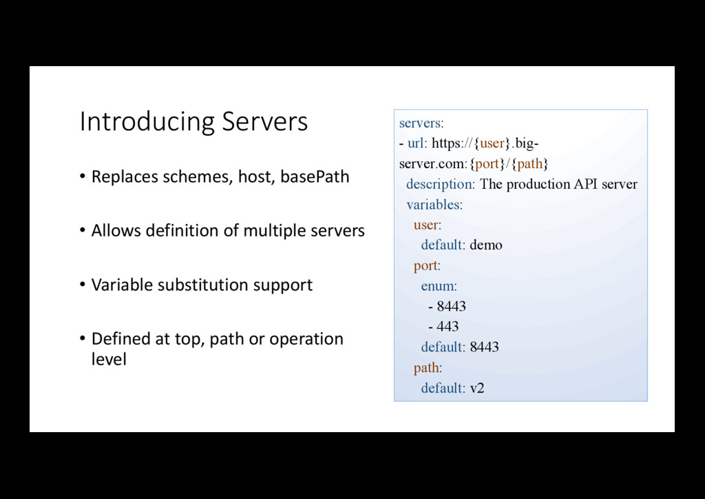 of multiple servers • Variable substitution support • Defined at top, path or operation level servers: - url: https://{user}.big- server.com:{port}/{path} description: The production API server variables: user: default: demo port: enum: - 8443 - 443 default: 8443 path: default: v2