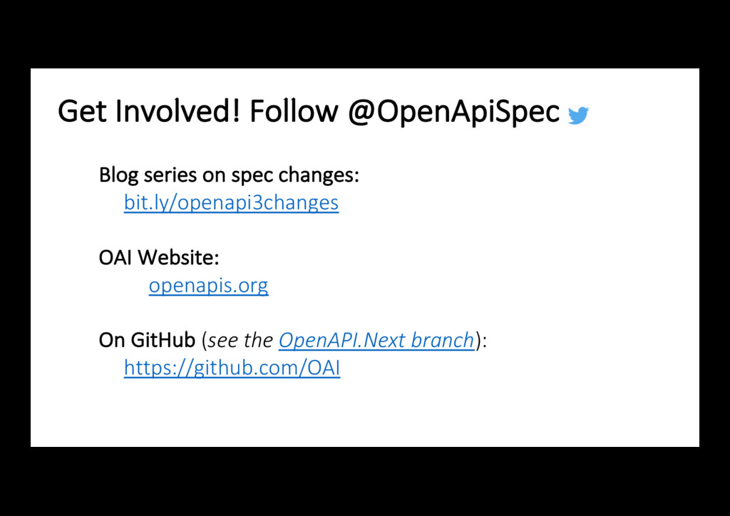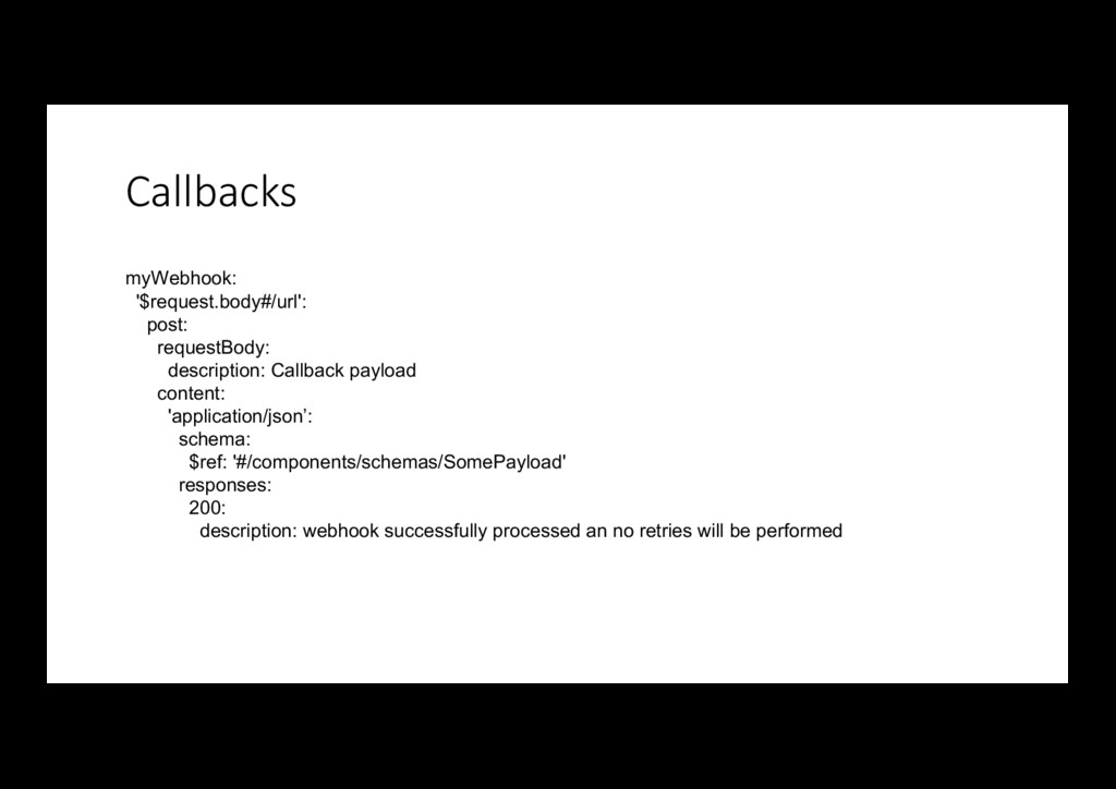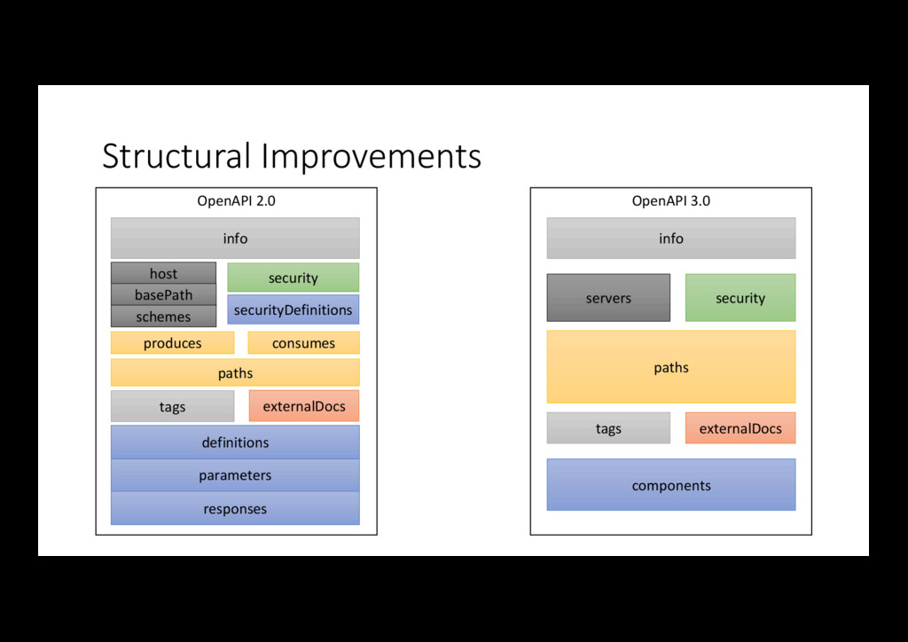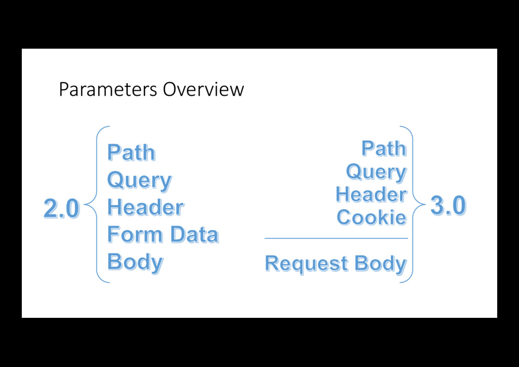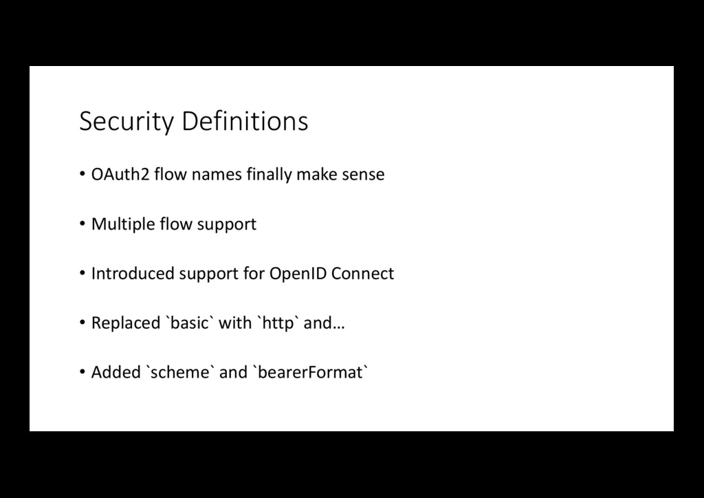 of multiple servers • Variable substitution support • Defined at top, path or operation level servers: - url: https://{user}.big- server.com:{port}/{path} description: The production API server variables: user: default: demo port: enum: - 8443 - 443 default: 8443 path: default: v2