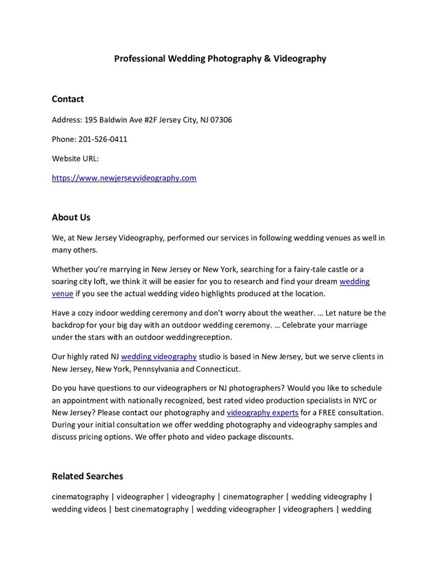 #2F Jersey City, NJ 07306 Phone: 201-526-0411 Website URL: https://www.newjerseyvideography.com About Us We, at New Jersey Videography, performed our services in following wedding venues as well in many others. Whether you’re marrying in New Jersey or New York, searching for a fairy-tale castle or a soaring city loft, we think it will be easier for you to research and find your dream wedding venue if you see the actual wedding video highlights produced at the location. Have a cozy indoor wedding ceremony and don’t worry about the weather. … Let nature be the backdrop for your big day with an outdoor wedding ceremony. … Celebrate your marriage under the stars with an outdoor weddingreception. Our highly rated NJ wedding videography studio is based in New Jersey, but we serve clients in New Jersey, New York, Pennsylvania and Connecticut. Do you have questions to our videographers or NJ photographers? Would you like to schedule an appointment with nationally recognized, best rated video production specialists in NYC or New Jersey? Please contact our photography and videography experts for a FREE consultation. During your initial consultation we offer wedding photography and videography samples and discuss pricing options. We offer photo and video package discounts. Related Searches cinematography | videographer | videography | cinematographer | wedding videography | wedding videos | best cinematography | wedding videographer | videographers | wedding