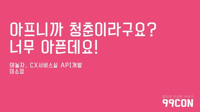 야놀자 CX개발실 API 파트에 7개월차 재직중인 이소정입니다. 저만의 울타리에 갇혀지내다가 99콘 발표를 권유해주셔서 처음 세상밖으로 나오게 되었는데요. 개발자 사이에서도 유명한 이상한모임에 발표자로 참여하게되어 매우 영광스럽습니다^^. 저의 험난한(?) 회사생활공유로 많은 분들이 공감해주셨으면 좋겠습니다!