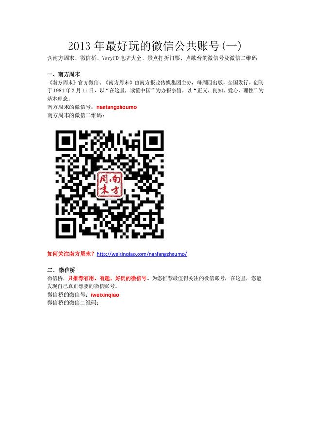 2013 年最好玩的微信公共账号(一) 含南方周末、微信桥、VeryCD 电驴大全、景点打折门票、点歌台的微信号及微信二维码 一、南方周末 《南方周末》官方微信。《南方周末》由南方报业传媒集团主办,每周四出版,全国发行。创刊 于 1984 年 2