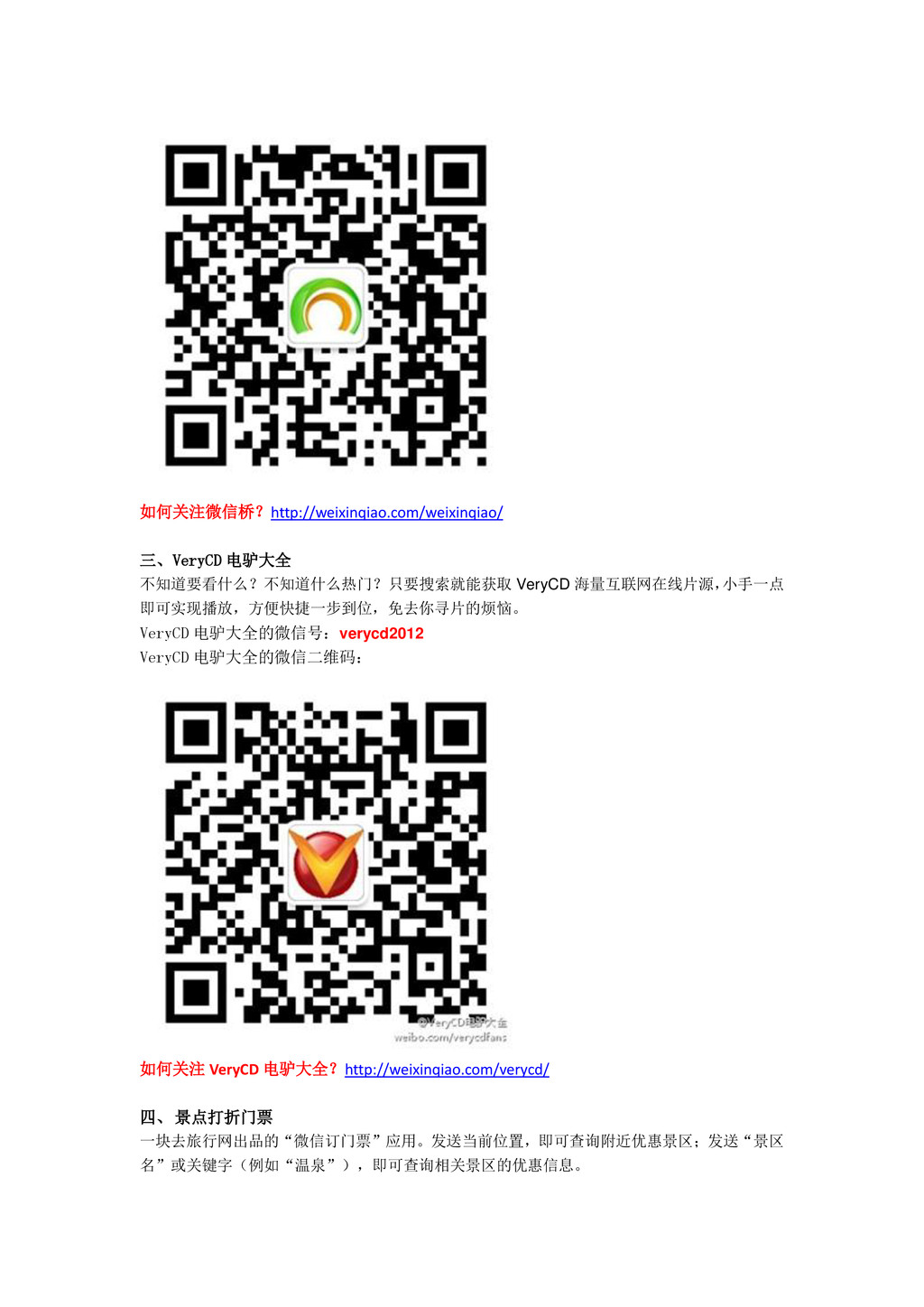 VeryCD 电驴大全的微信二维码: 如何关注 VeryCD 电驴大全?http://weixinqiao.com/verycd/ 四、 景点打折门票 一块去旅行网出品的“微信订门票”应用。发送当前位置,即可查询附近优惠景区;发送“景区 名”或关键字(例如“温泉”),即可查询相关景区的优惠信息。