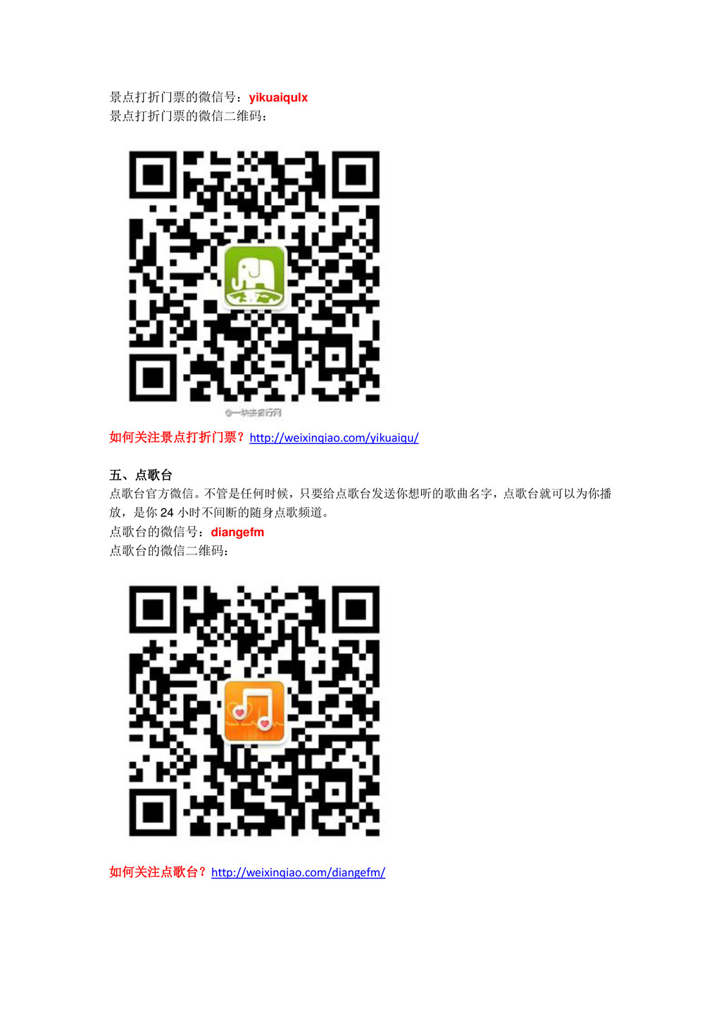 景点打折门票的微信号:yikuaiqulx 景点打折门票的微信二维码: 如何关注景点打折门票?http://weixinqiao.com/yikuaiqu/ 五、点歌台 点歌台官方微信。不管是任何时候,只要给点歌台发送你想听的歌曲名字,点歌台就可以为你播 放,是你 24 小时不间断的随身点歌频道。 点歌台的微信号:diangefm 点歌台的微信二维码: