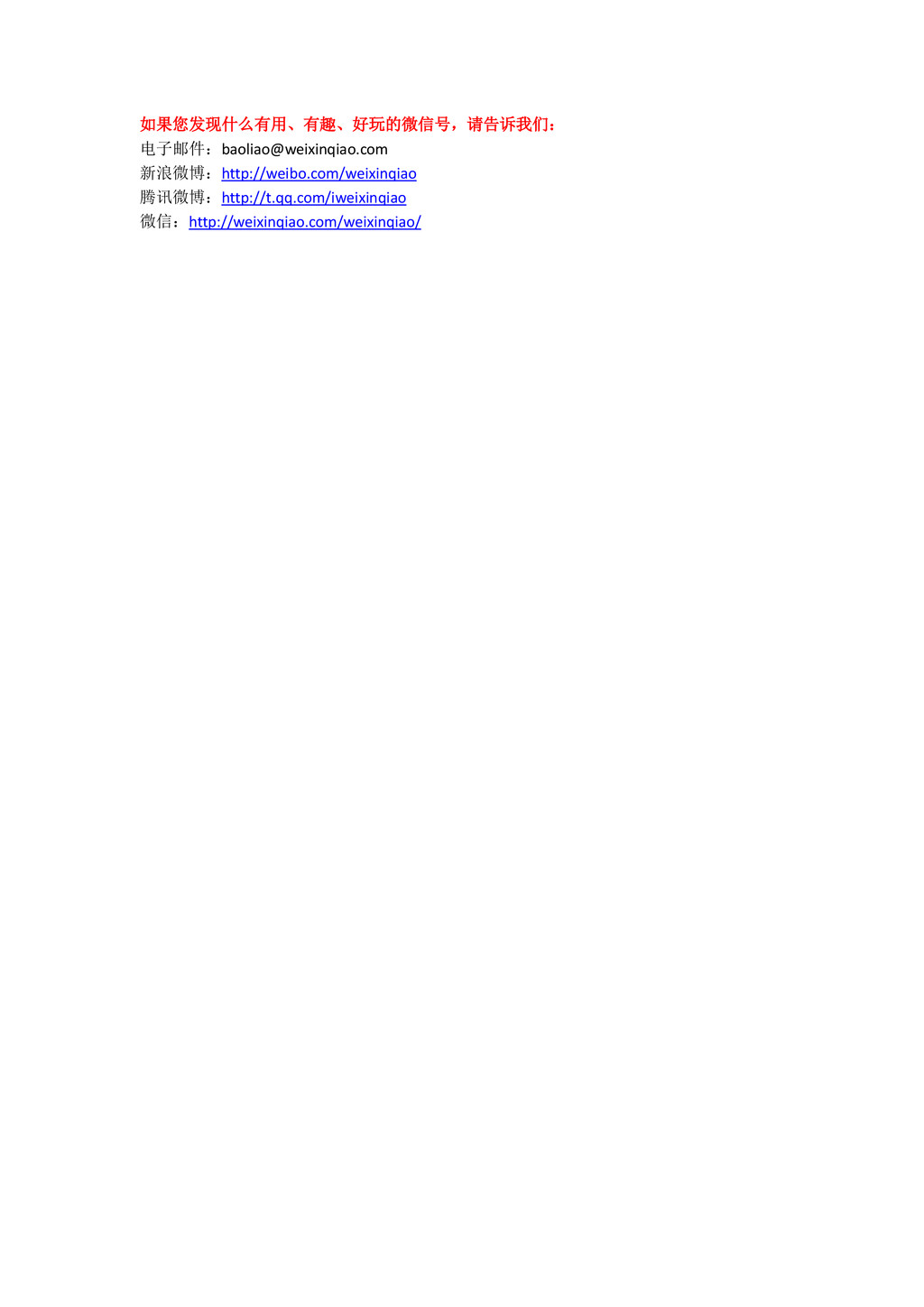 新浪微博:http://weibo.com/weixinqiao 腾讯微博:http://t.qq.com/iweixinqiao 微信:http://weixinqiao.com/weixinqiao/