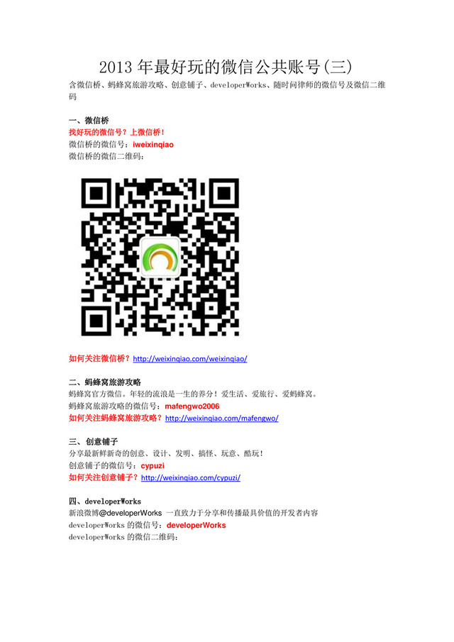 2013 年最好玩的微信公共账号(三) 含微信桥、蚂蜂窝旅游攻略、创意铺子、developerWorks、随时问律师的微信号及微信二维 码 一、微信桥 找好玩的微信号?上微信桥! 微信桥的微信号:iweixinqiao 微信桥的微信二维码: 如何关注微信桥?http://weixinqiao.com/weixinqiao/ 二、蚂蜂窝旅游攻略