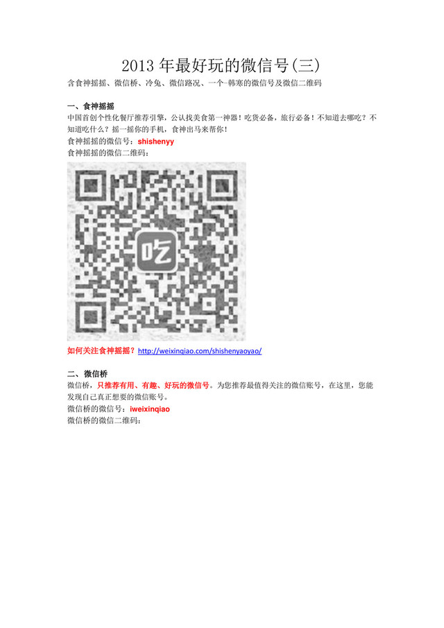 2013 年最好玩的微信号(三) 含食神摇摇、微信桥、冷兔、微信路况、一个-韩寒的微信号及微信二维码 一、食神摇摇 中国首创个性化餐厅推荐引擎,公认找美食第一神器!吃货必备,旅行必备!不知道去哪吃?不 知道吃什么?摇一摇你的手机,食神出马来帮你! 食神摇摇的微信号:shishenyy 食神摇摇的微信二维码: 如何关注食神摇摇?http://weixinqiao.com/shishenyaoyao/ 二、
