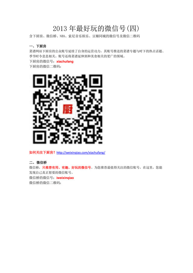 2013 年最好玩的微信号(四) 含下厨房、微信桥、NBA、索尼音乐娱乐、豆瓣同城的微信号及微信二维码 一、下厨房 菜谱网站下厨房的公众账号延续了自身的运营功力,其账号推送的菜谱专题与时下的热点话题、 季节时令息息相关。账号还将菜谱延伸到和美食相关的更广的领域。 下厨房的微信号:xiachufang 下厨房的微信二维码: 如何关注下厨房?http://weixinqiao.com/xiachufang/ 二、
