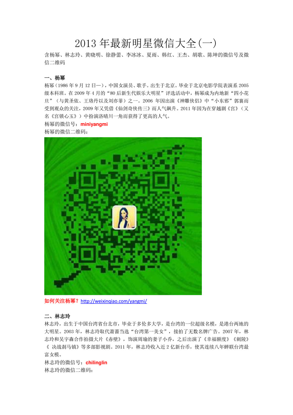 12 日—) , 中国女演员、 歌手。 出生于北京。 毕业于北京电影学院表演系 2005 级本科班。在 2009 年 4 月的“80 后新生代娱乐大明星”评选活动中,杨幂成为内地新“四小花 旦”(与黄圣依、王珞丹以及刘亦菲)之一。2006 年因出演《神雕侠侣》中“小东邪”郭襄而 受到观众的关注,2009 年又凭借《仙剑奇侠传三》而人气飙升。2011 年因为在穿越剧《宫》 (又 名《宫锁心玉》)中扮演洛晴川一角而获得了更高的人气。 杨幂的微信号:miniyangmi 杨幂的微信二维码: 如何关注杨幂?http://weixinqiao.com/yangmi/ 二、林志玲 林志玲,出生于中国台湾省台北市,毕业于多伦多大学,是台湾的一位超级名模,是港台两地的 大明星。2003 年,林志玲取代萧蔷当选“台湾第一美女”,接拍了无数名牌广告。2007 年,林 志玲和吴宇森合作拍摄大片《赤壁》,饰演周瑜的妻子小乔,之后出演了《幸福额度》《刺陵》 《 决战刹马镇》等多部影视剧。2011 年,林志玲收入近 2 亿新台币,使其连续八年蝉联台湾最 富女模。 林志玲的微信号:chilinglin 林志玲的微信二维码: