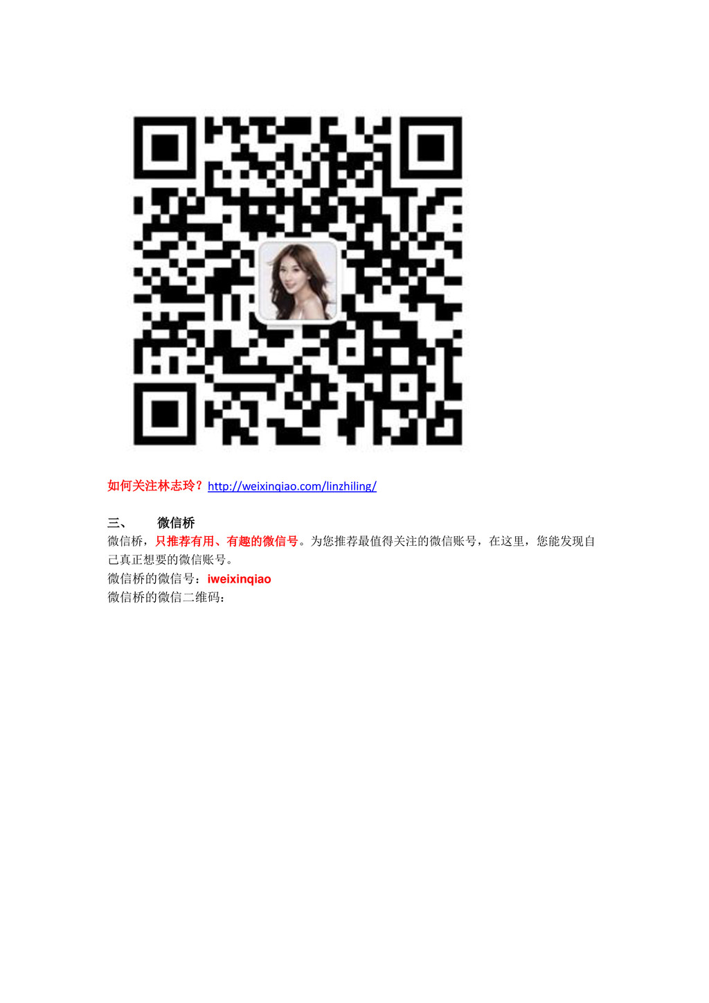 如何关注林志玲?http://weixinqiao.com/linzhiling/ 三、 微信桥 微信桥,只推荐有用、有趣的微信号。为您推荐最值得关注的微信账号,在这里,您能发现自 己真正想要的微信账号。 微信桥的微信号:iweixinqiao 微信桥的微信二维码:
