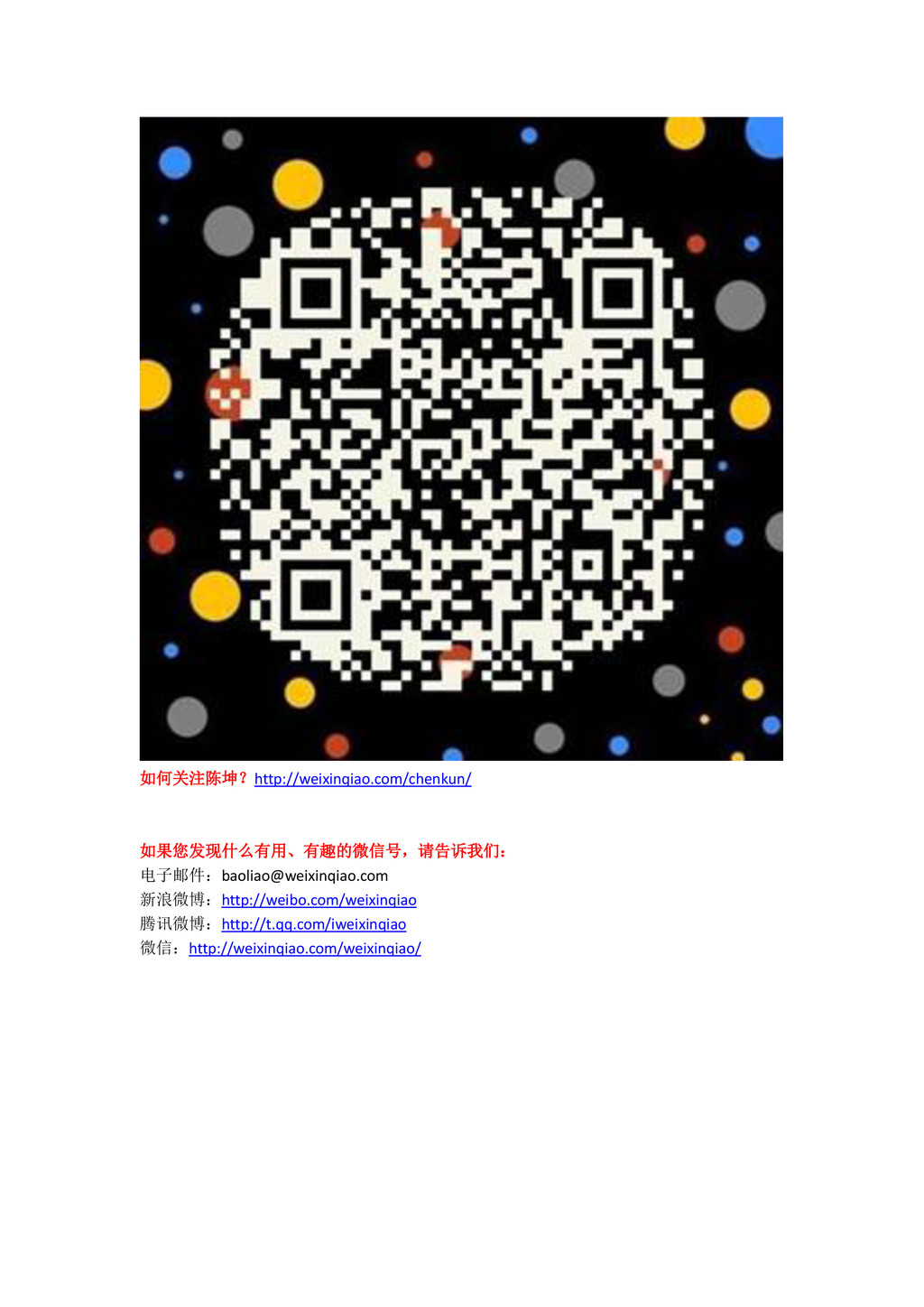 新浪微博:http://weibo.com/weixinqiao 腾讯微博:http://t.qq.com/iweixinqiao 微信:http://weixinqiao.com/weixinqiao/