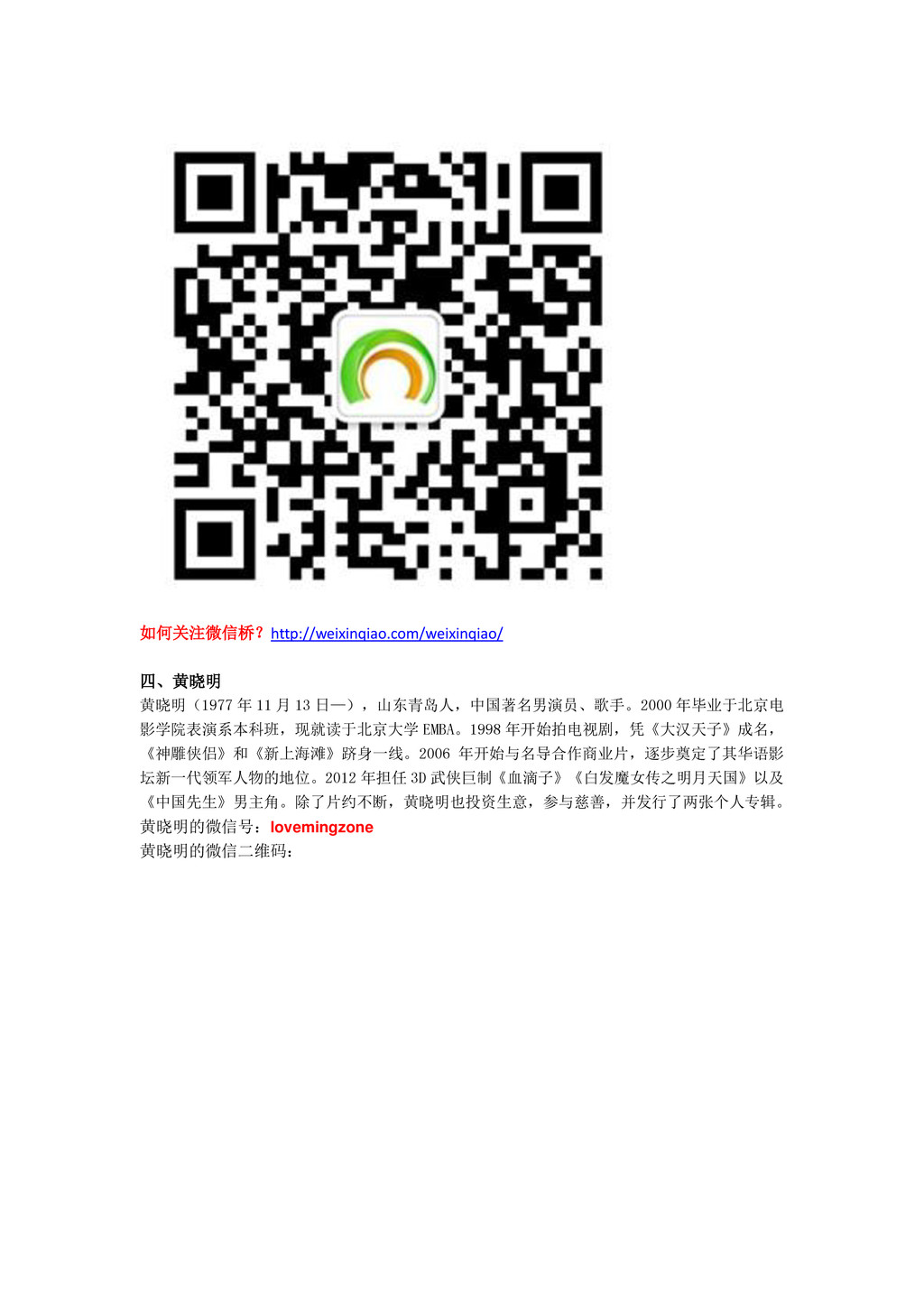 如何关注微信桥?http://weixinqiao.com/weixinqiao/ 四、黄晓明 黄晓明(1977 年 11 月 13 日—),山东青岛人,中国著名男演员、歌手。2000 年毕业于北京电 影学院表演系本科班,现就读于北京大学