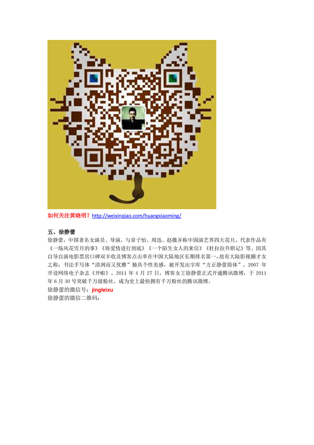 如何关注黄晓明?http://weixinqiao.com/huangxiaoming/ 五、徐静蕾 徐静蕾,中国著名女演员、导演,与章子怡、周迅、赵薇并称中国演艺界四大花旦。代表作品有 《一场风花雪月的事》《将爱情进行到底》《一个陌生女人的来信》《杜拉拉升职记》等。因其 自导自演电影票房口碑双丰收及博客点击率在中国大陆地区长期排名第一, 故有大陆影视圈才女 之称;书法手写体“清冽而又优雅”独具个性美感,被开发出字库“方正静蕾简体”。2007 年 开设网络电子杂志《开啦》。2011 年
