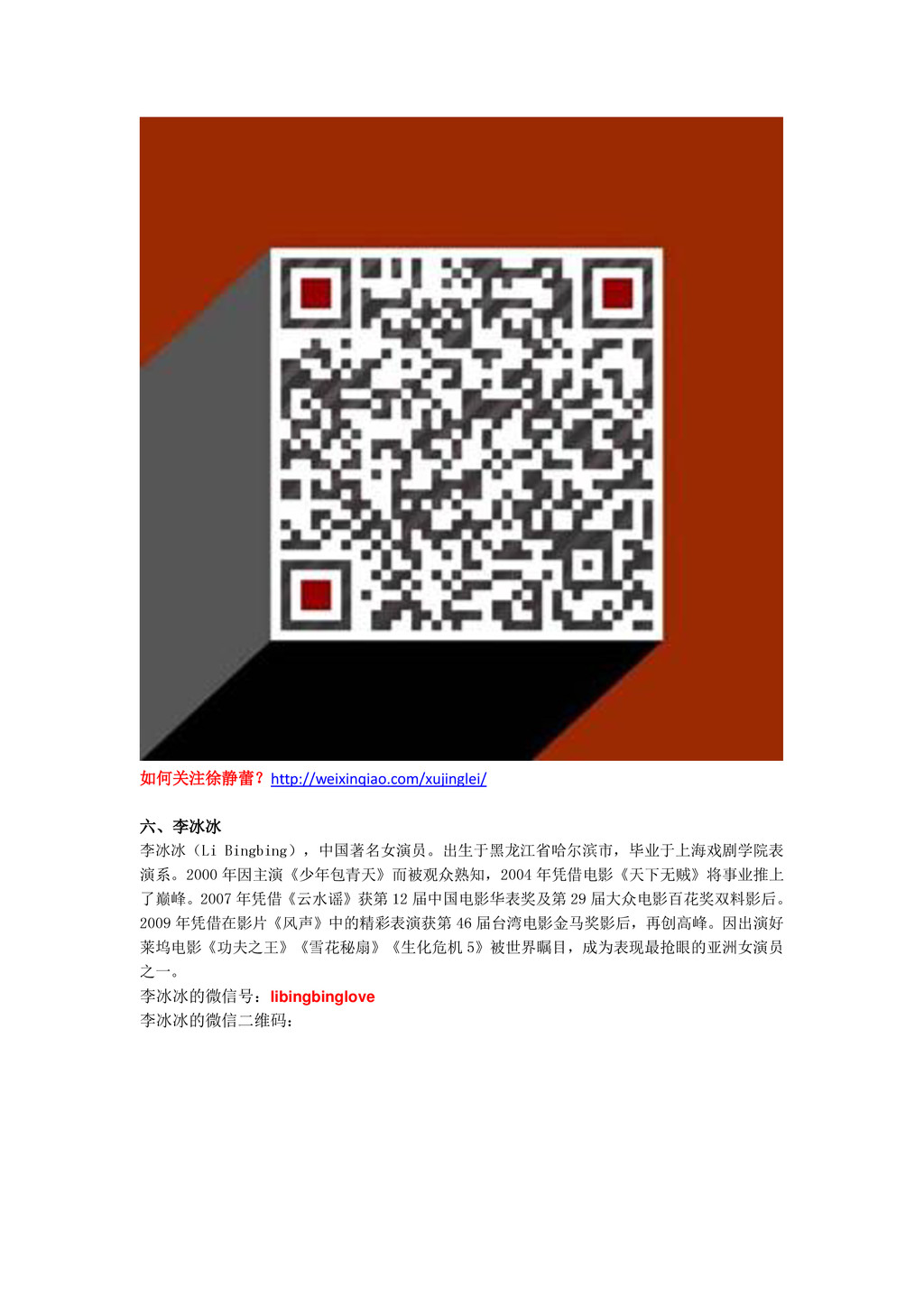 如何关注徐静蕾?http://weixinqiao.com/xujinglei/ 六、李冰冰 李冰冰(Li Bingbing),中国著名女演员。出生于黑龙江省哈尔滨市,毕业于上海戏剧学院表 演系。2000 年因主演《少年包青天》而被观众熟知,2004 年凭借电影《天下无贼》将事业推上 了巅峰。2007 年凭借《云水谣》获第 12