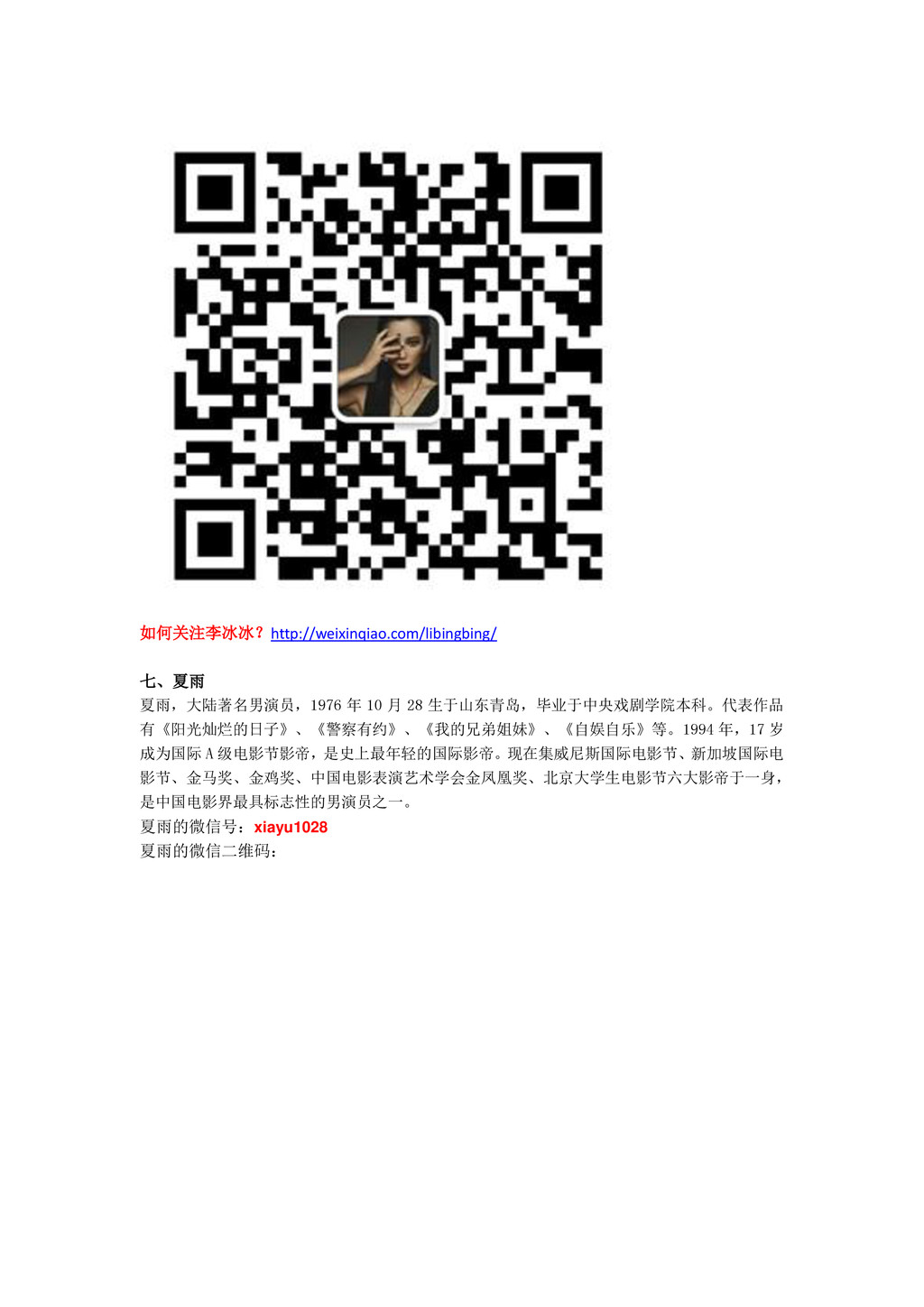 如何关注李冰冰?http://weixinqiao.com/libingbing/ 七、夏雨 夏雨,大陆著名男演员,1976 年 10 月 28 生于山东青岛,毕业于中央戏剧学院本科。代表作品 有《阳光灿烂的日子》、《警察有约》、《我的兄弟姐妹》、《自娱自乐》等。1994 年,17