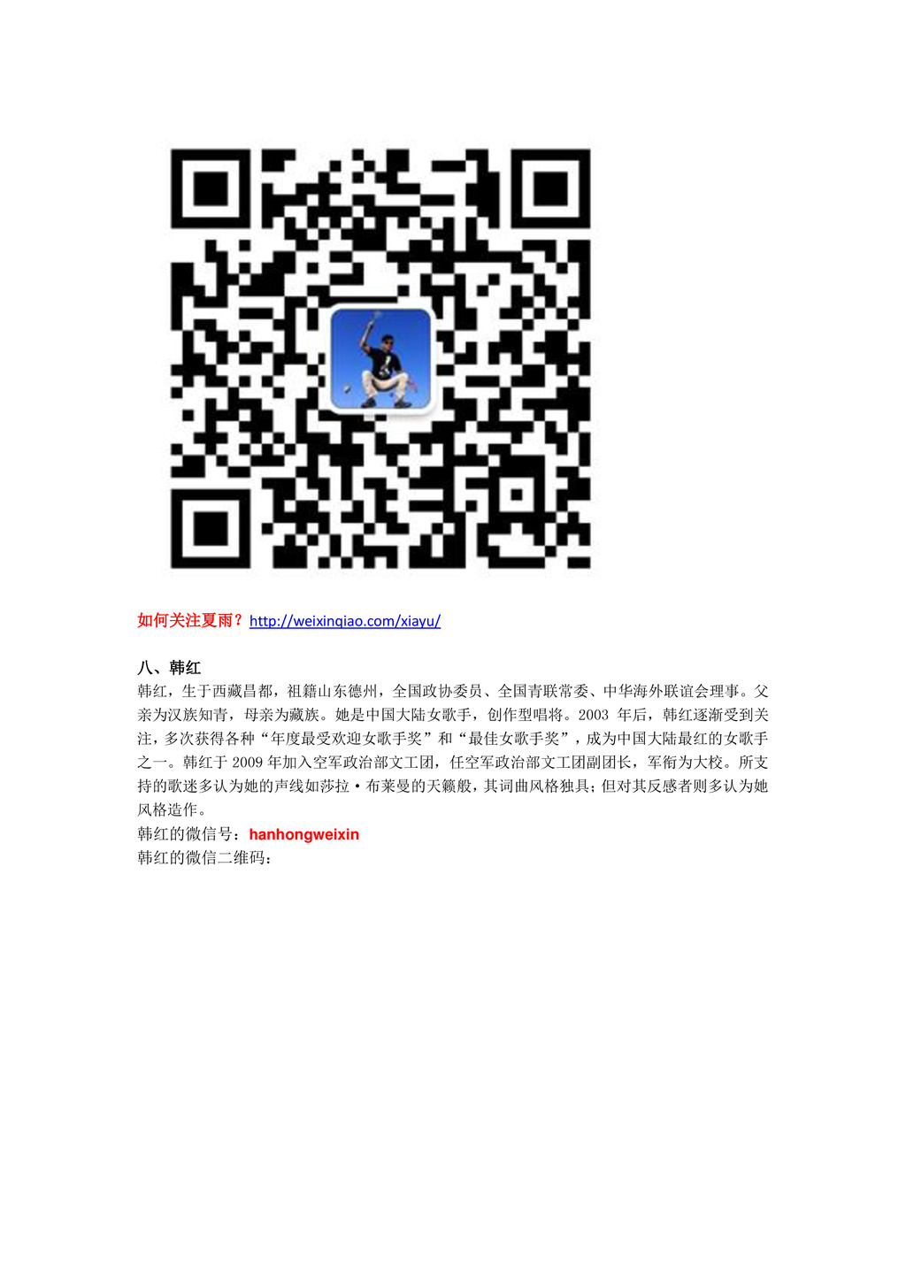 如何关注夏雨?http://weixinqiao.com/xiayu/ 八、韩红 韩红,生于西藏昌都,祖籍山东德州,全国政协委员、全国青联常委、中华海外联谊会理事。父 亲为汉族知青,母亲为藏族。她是中国大陆女歌手,创作型唱将。2003 年后,韩红逐渐受到关 注, 多次获得各种“年度最受欢迎女歌手奖”和“最佳女歌手奖”, 成为中国大陆最红的女歌手 之一。韩红于 2009