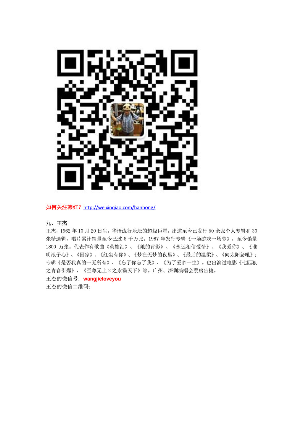 如何关注韩红?http://weixinqiao.com/hanhong/ 九、王杰 王杰,1962 年 10 月 20 日生,华语流行乐坛的超级巨星,出道至今已发行 50 余张个人专辑和