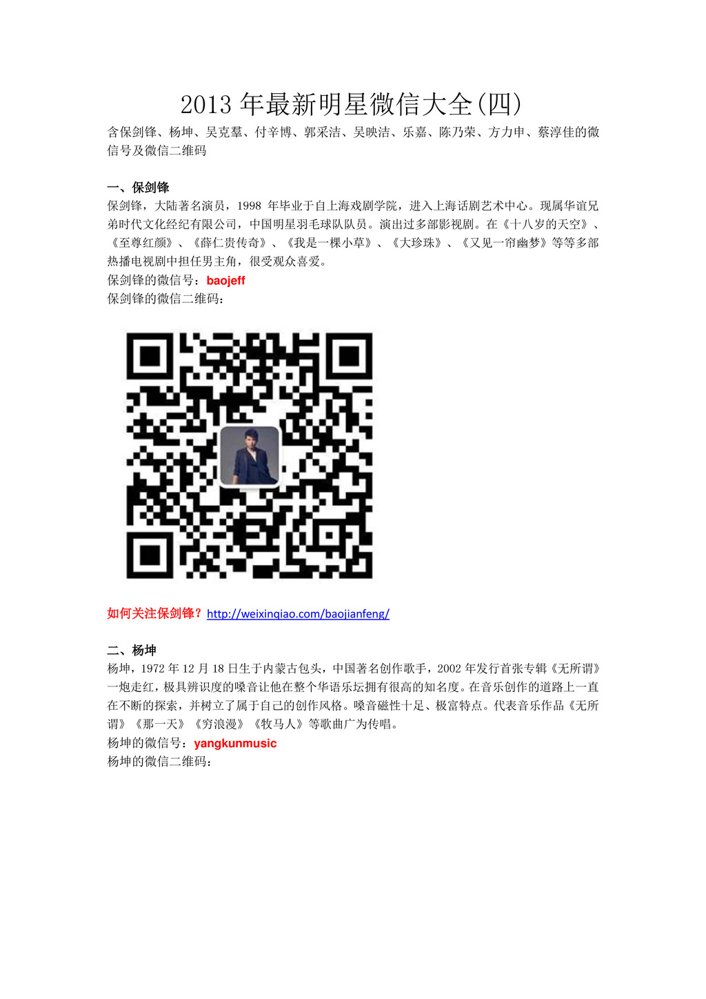 2013 年最新明星微信大全(四) 含保剑锋、杨坤、吴克羣、付辛博、郭采洁、吴映洁、乐嘉、陈乃荣、方力申、蔡淳佳的微 信号及微信二维码 一、保剑锋 保剑锋,大陆著名演员,1998 年毕业于自上海戏剧学院,进入上海话剧艺术中心。现属华谊兄 弟时代文化经纪有限公司,中国明星羽毛球队队员。演出过多部影视剧。在《十八岁的天空》、 《至尊红颜》、《薛仁贵传奇》、《我是一棵小草》、《大珍珠》、《又见一帘幽梦》等等多部 热播电视剧中担任男主角,很受观众喜爱。
