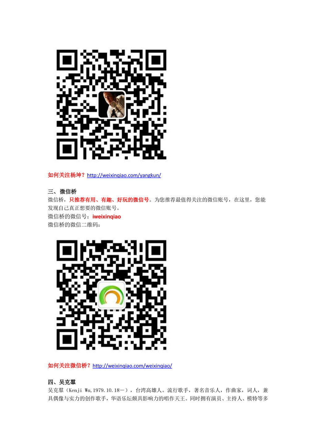 如何关注杨坤?http://weixinqiao.com/yangkun/ 三、 微信桥 微信桥,只推荐有用、有趣、好玩的微信号。为您推荐最值得关注的微信账号,在这里,您能 发现自己真正想要的微信账号。 微信桥的微信号:iweixinqiao 微信桥的微信二维码: 如何关注微信桥?http://weixinqiao.com/weixinqiao/ 四、吴克羣 吴克羣(Kenji