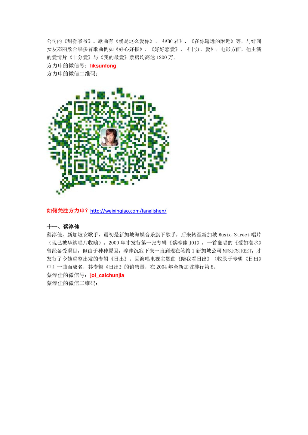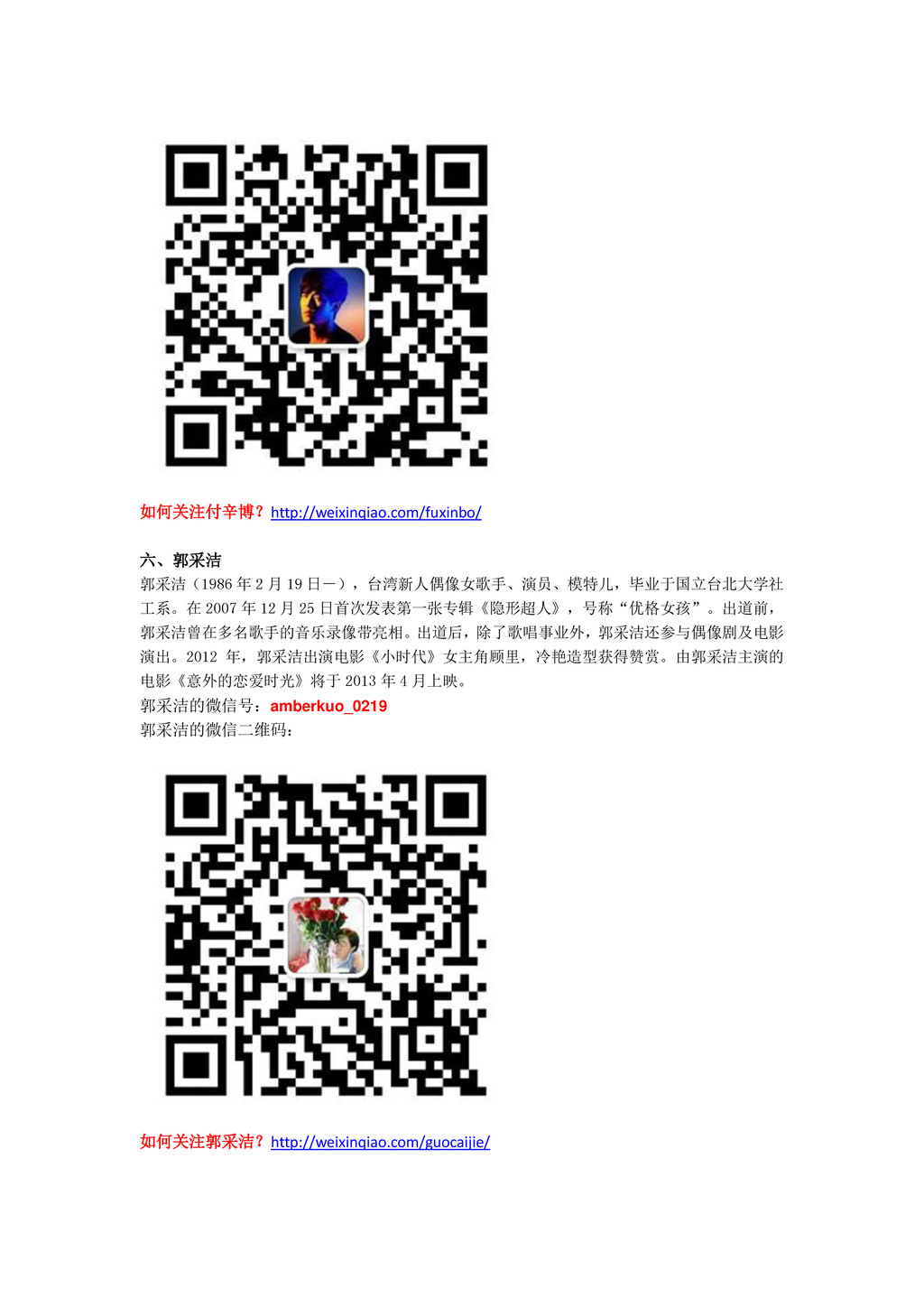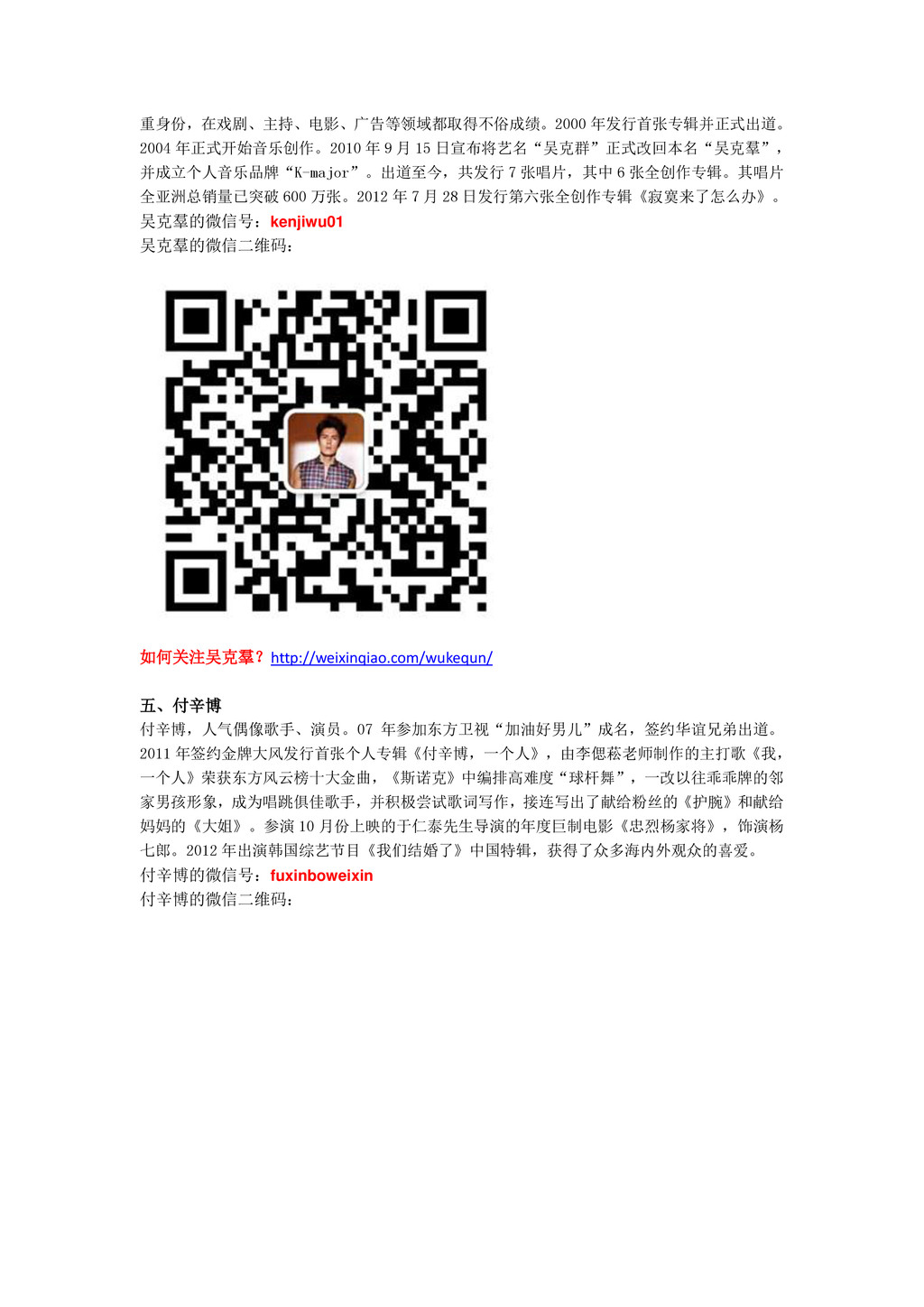 7 张唱片,其中 6 张全创作专辑。其唱片 全亚洲总销量已突破 600 万张。2012 年 7 月 28 日发行第六张全创作专辑《寂寞来了怎么办》。 吴克羣的微信号:kenjiwu01 吴克羣的微信二维码: 如何关注吴克羣?http://weixinqiao.com/wukequn/ 五、付辛博 付辛博,人气偶像歌手、演员。07 年参加东方卫视“加油好男儿”成名,签约华谊兄弟出道。 2011 年签约金牌大风发行首张个人专辑《付辛博,一个人》,由李偲菘老师制作的主打歌《我, 一个人》荣获东方风云榜十大金曲,《斯诺克》中编排高难度“球杆舞”,一改以往乖乖牌的邻 家男孩形象,成为唱跳俱佳歌手,并积极尝试歌词写作,接连写出了献给粉丝的《护腕》和献给 妈妈的《大姐》。参演 10 月份上映的于仁泰先生导演的年度巨制电影《忠烈杨家将》,饰演杨 七郎。2012 年出演韩国综艺节目《我们结婚了》中国特辑,获得了众多海内外观众的喜爱。 付辛博的微信号:fuxinboweixin 付辛博的微信二维码: