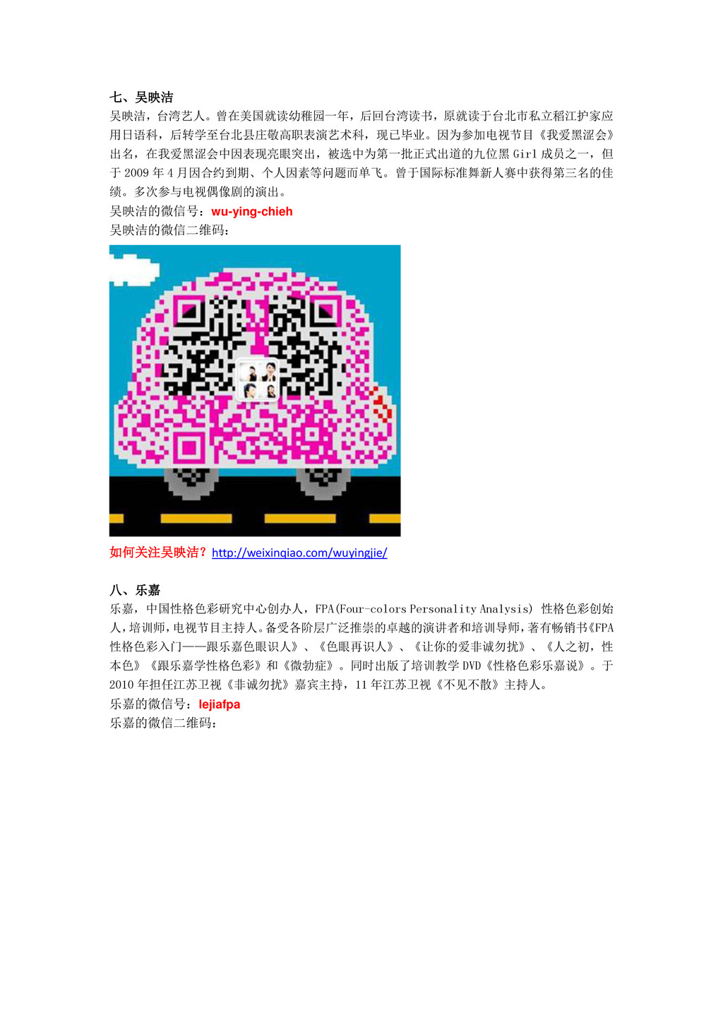 月因合约到期、个人因素等问题而单飞。曾于国际标准舞新人赛中获得第三名的佳 绩。多次参与电视偶像剧的演出。 吴映洁的微信号:wu-ying-chieh 吴映洁的微信二维码: 如何关注吴映洁?http://weixinqiao.com/wuyingjie/ 八、乐嘉 乐嘉,中国性格色彩研究中心创办人,FPA(Four-colors Personality Analysis) 性格色彩创始 人, 培训师, 电视节目主持人。 备受各阶层广泛推崇的卓越的演讲者和培训导师, 著有畅销书 《FPA 性格色彩入门——跟乐嘉色眼识人》、《色眼再识人》、《让你的爱非诚勿扰》、《人之初,性 本色》《跟乐嘉学性格色彩》和《微勃症》。同时出版了培训教学 DVD《性格色彩乐嘉说》。于 2010 年担任江苏卫视《非诚勿扰》嘉宾主持,11 年江苏卫视《不见不散》主持人。 乐嘉的微信号:lejiafpa 乐嘉的微信二维码: