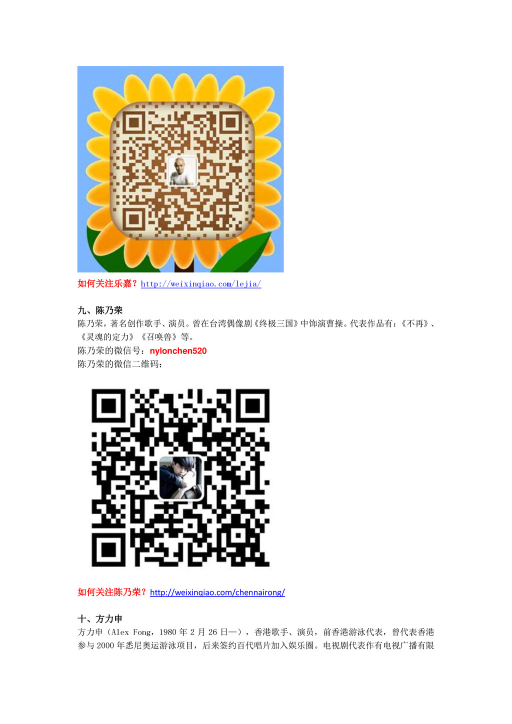、 《灵魂的定力》《召唤兽》等。 陈乃荣的微信号:nylonchen520 陈乃荣的微信二维码: 如何关注陈乃荣?http://weixinqiao.com/chennairong/ 十、方力申 方力申(Alex Fong,1980 年 2 月 26 日—),香港歌手、演员,前香港游泳代表,曾代表香港 参与 2000 年悉尼奥运游泳项目,后来签约百代唱片加入娱乐圈。电视剧代表作有电视广播有限