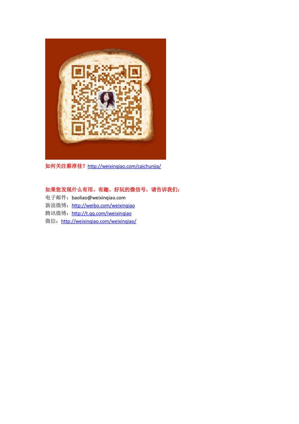 如何关注蔡淳佳?http://weixinqiao.com/caichunjia/ 如果您发现什么有用、有趣、好玩的微信号,请告诉我们: 电子邮件: