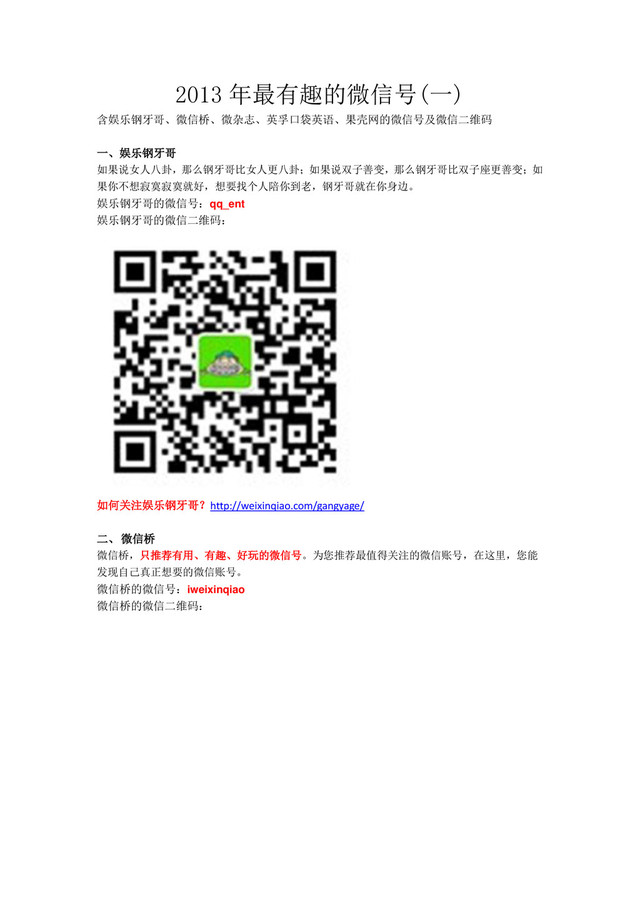 2013 年最有趣的微信号(一) 含娱乐钢牙哥、微信桥、微杂志、英孚口袋英语、果壳网的微信号及微信二维码 一、娱乐钢牙哥 如果说女人八卦,那么钢牙哥比女人更八卦;如果说双子善变,那么钢牙哥比双子座更善变;如 果你不想寂寞寂寞就好,想要找个人陪你到老,钢牙哥就在你身边。 娱乐钢牙哥的微信号:qq_ent 娱乐钢牙哥的微信二维码: 如何关注娱乐钢牙哥?http://weixinqiao.com/gangyage/ 二、
