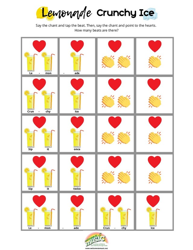 Ice Sip it once - Sip it twice Le mon - ade - Crun chy Ice - Say the chant and tap the beat. Then, say the chant and point to the hearts. How many beats are there?