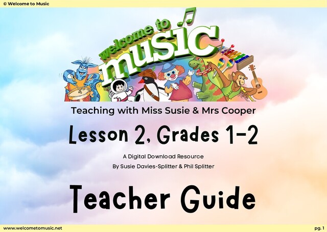 Cooper Grades 1-2 Lesson 2- Teacher Guide © Davies-Splitter/Splitter www.welcometomusic.net Bee Bee (02:45) Cuddles Koala (09:06) Up High Down Low (17:50) Calypso (20:30) Make a Racket (28:50) Goodbye (39:10) Video Timestamps pg. 3 Rhythm–sound/silence, beat, rhythm ta, ti ti & zaa. Pitch – high/low, going up & going down, pitch matching, sml prep & handsigns. Expression – loud/soft, forte/piano, fast/slow. Form –same/different, patterns. Timbre/Tone Colour – how sound is produced, different voices. Notation – beat, ta, ti ti and za, sm on 2 line staff. Musical Concepts
