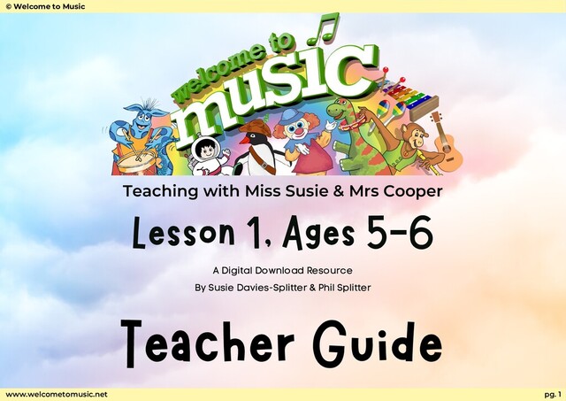 Cooper Ages 5-6 Lesson 1- Teacher Guide © Davies-Splitter/Splitter www.welcometomusic.net It's Music Time (02:02) Hello Funkey (11:53) My Friend Fuzzy (15:35) Move It (26:00) Play and Stop (30:45) Let's Clap (35:43) Lesson 1 Video Timestamps pg. 3 Rhythm–sound/silence, beat,; rhythm ta, ti ti & zaa. Pitch – high/low, going up & going down, pitch matching, sml prep & handsigns. Expression – loud/soft, forte/piano, fast/slow. Form –same/different, patterns. Timbre/Tone Colour – how sound is produced, different voices. Notation – beat, ta, ti ti and za, sm on 2 line staff. Musical Concepts