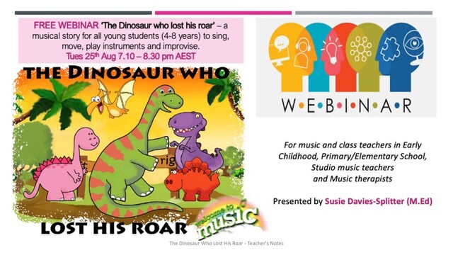 and dancers (It was time for Desmond and his friends to go on a big trip – some of them joined the dinosaur orchestra to serenade him on his way and some of them joined the dinosaur dancing troupe to send out some positive vibes). This page in the book has no words. Verse 5 – (spoken) They trekked over mountains, and swam over seas. They searched through craters, and climbed over trees. Chorus 1 Poor poor Desmond! Awww! Poor poor Desmond! Awww! Verse 6 – (spoken) Then came along a big blow fly. Flying and buzzing – my oh my! Chorus 1 Poor poor Desmond! Awww! Poor poor Desmond! Awww! Verse 7 – (spoken) It flew up Desmond’s nose, can you believe! And that was enough to make him ‘freeze’! Chorus 1 Poor poor Desmond! Awww! Poor poor Desmond! Awww! The Dinosaur Who Lost His Roar - Teacher's Notes ‘The Dinosaur Rock’ Chorus (this can be spoken or sung) So Desmond reached up, then down to the floor. He shook his head, let out a big roar!! ROAR!!! He turned round and round, then you wouldn’t believe. He blew that fly right out of his nose with a mighty dinosaur sneeze, AHH-CHOO!!