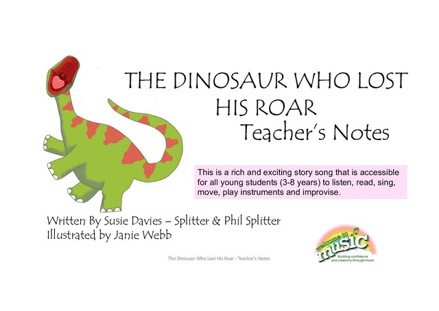 and dancers (It was time for Desmond and his friends to go on a big trip – some of them joined the dinosaur orchestra to serenade him on his way and some of them joined the dinosaur dancing troupe to send out some positive vibes). This page in the book has no words. Verse 5 – (spoken) They trekked over mountains, and swam over seas. They searched through craters, and climbed over trees. Chorus 1 Poor poor Desmond! Awww! Poor poor Desmond! Awww! Verse 6 – (spoken) Then came along a big blow fly. Flying and buzzing – my oh my! Chorus 1 Poor poor Desmond! Awww! Poor poor Desmond! Awww! Verse 7 – (spoken) It flew up Desmond’s nose, can you believe! And that was enough to make him ‘freeze’! Chorus 1 Poor poor Desmond! Awww! Poor poor Desmond! Awww! The Dinosaur Who Lost His Roar - Teacher's Notes ‘The Dinosaur Rock’ Chorus (this can be spoken or sung) So Desmond reached up, then down to the floor. He shook his head, let out a big roar!! ROAR!!! He turned round and round, then you wouldn’t believe. He blew that fly right out of his nose with a mighty dinosaur sneeze, AHH-CHOO!!
