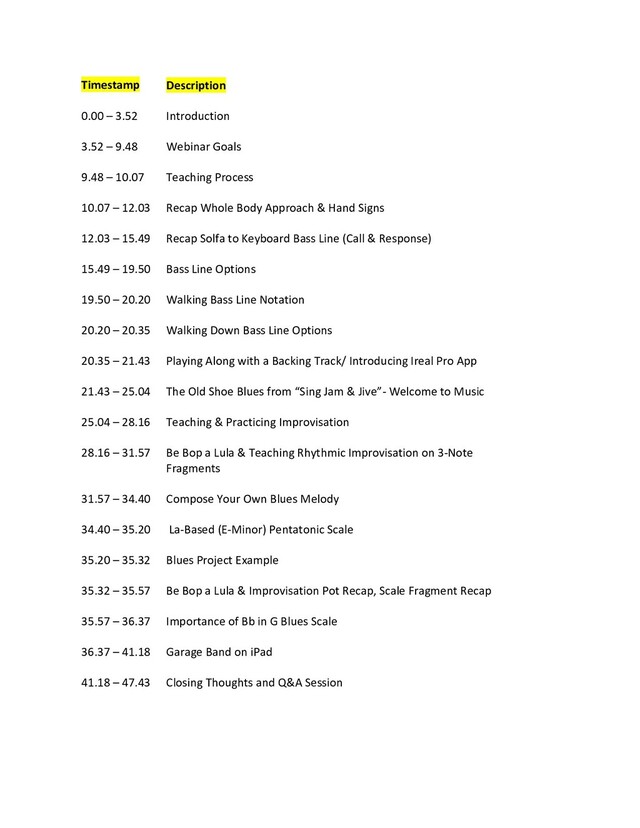 Goals 9.48 – 10.07 Teaching Process 10.07 – 12.03 Recap Whole Body Approach & Hand Signs 12.03 – 15.49 Recap Solfa to Keyboard Bass Line (Call & Response) 15.49 – 19.50 Bass Line Options 19.50 – 20.20 Walking Bass Line Notation 20.20 – 20.35 Walking Down Bass Line Options 20.35 – 21.43 Playing Along with a Backing Track/ Introducing Ireal Pro App 21.43 – 25.04 The Old Shoe Blues from “Sing Jam & Jive”- Welcome to Music 25.04 – 28.16 Teaching & Practicing Improvisation 28.16 – 31.57 Be Bop a Lula & Teaching Rhythmic Improvisation on 3-Note Fragments 31.57 – 34.40 Compose Your Own Blues Melody 34.40 – 35.20 La-Based (E-Minor) Pentatonic Scale 35.20 – 35.32 Blues Project Example 35.32 – 35.57 Be Bop a Lula & Improvisation Pot Recap, Scale Fragment Recap 35.57 – 36.37 Importance of Bb in G Blues Scale 36.37 – 41.18 Garage Band on iPad 41.18 – 47.43 Closing Thoughts and Q&A Session