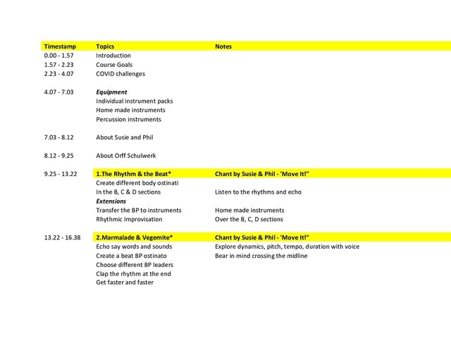 a D On a percussion instrument, found sound, Boomwhacker or recorder Play a bordun accompaniment Simple ostinato Play a rhythmic ostinato on found sounds Improvisation Over the 3rd phrase for 8 beats Add movement Do a different movement for each phrase Create your own dance Add ukulele D chord or play with a C chord Sing and play in a 2 or 4 part canon Putting it together Add BP ostinato, instrument accompaniment, sing in canon etc 1.06.41 - 1.19.13 9.The Jiggles* Swing jazz piece by Susie & Phil - 'Razzamajazz', 'Take Orff with Jazz' Imitate the actions Listen to the spoken words Imitate the actions Listen to the sung words Click fingers on the off beats Listen to the sung words Sing the bass ostinato accompaniment In words and then solfa Play the ostinato On percussion instruments Improvisation Over an E lah pentatonic scale on recorder and percussion Watch Susie & Phil with students at St Peter's School in Johannesburg, Sth Africa With students in Lihir, PNG With students at the Music Enlightenment Project, Braamfontein, Johannesburg, Sth Africa Learning the dance steps, sing and dance in a round, vocal improvisation, 1.19.13 - 1.26.35 10.I can do it* Song to energise and inspire by Susie & Phil - 'Anything is Possible' Chorus Do the actions Listen to the spoken words