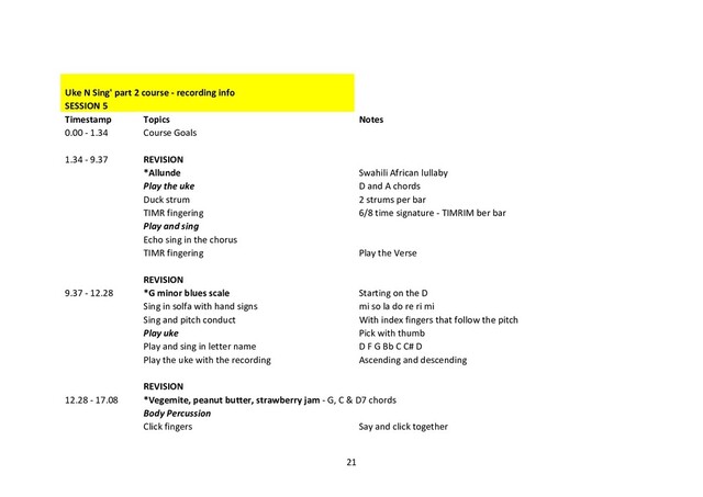 SESSION 5 Timestamp Topics Notes 0.00 - 1.34 Course Goals 1.34 - 9.37 REVISION *Allunde Swahili African lullaby Play the uke D and A chords Duck strum 2 strums per bar TIMR fingering 6/8 time signature - TIMRIM ber bar Play and sing Echo sing in the chorus TIMR fingering Play the Verse REVISION 9.37 - 12.28 *G minor blues scale Starting on the D Sing in solfa with hand signs mi so la do re ri mi Sing and pitch conduct With index fingers that follow the pitch Play uke Pick with thumb Play and sing in letter name D F G Bb C C# D Play the uke with the recording Ascending and descending REVISION 12.28 - 17.08 *Vegemite, peanut butter, strawberry jam - G, C & D7 chords Body Percussion Click fingers Say and click together