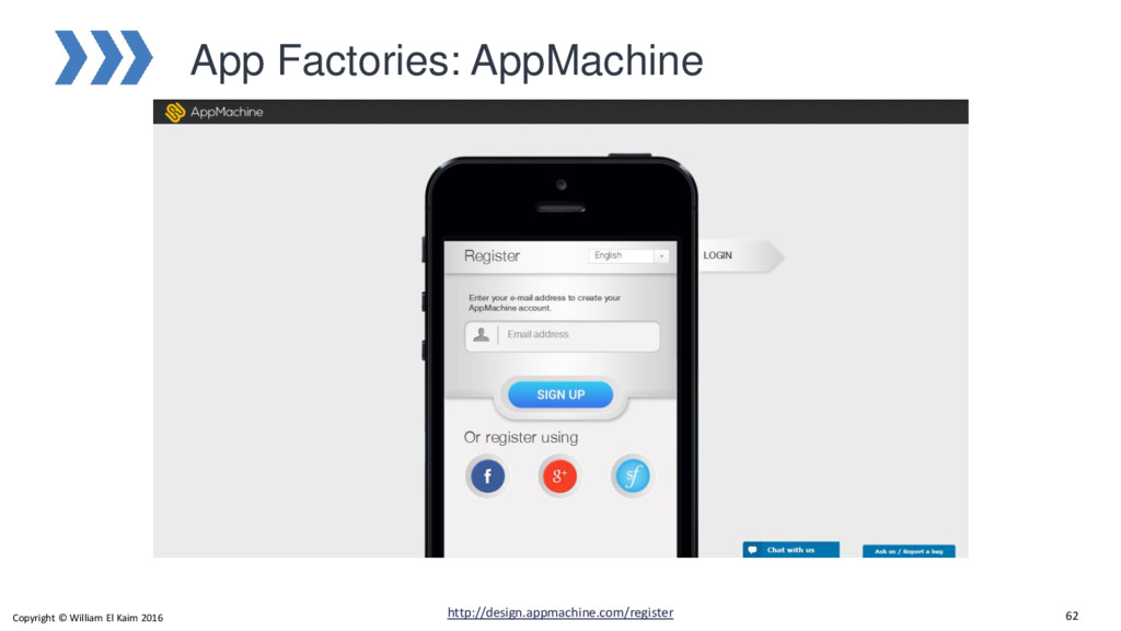 Build, manage and share living style guides and design systems • VerifyApp: Pre-development A/B Testing, design surveys, etc. • SolidifyApp: Multi-device user testing, behavior analysis, etc. User Testing • MindNode: For paper-less brainstorming of site user flows, etc. • Lucid Chart: For clean and fast process flow creation for digital strategies, and site architecture maps. • Random User Generator: A free, open- source API for generating random user data. Like Lorem Ipsum, but for people • Keynotopia: Transforms Keynote and PowerPoint into mobile, web and desktop app mockups/ • FullStory: lets your company easily record, replay, search, and analyze each user's actual experience with your website • FastLane: Automate build and release of iOS and Android apps Copyright © William El Kaim 2016 107