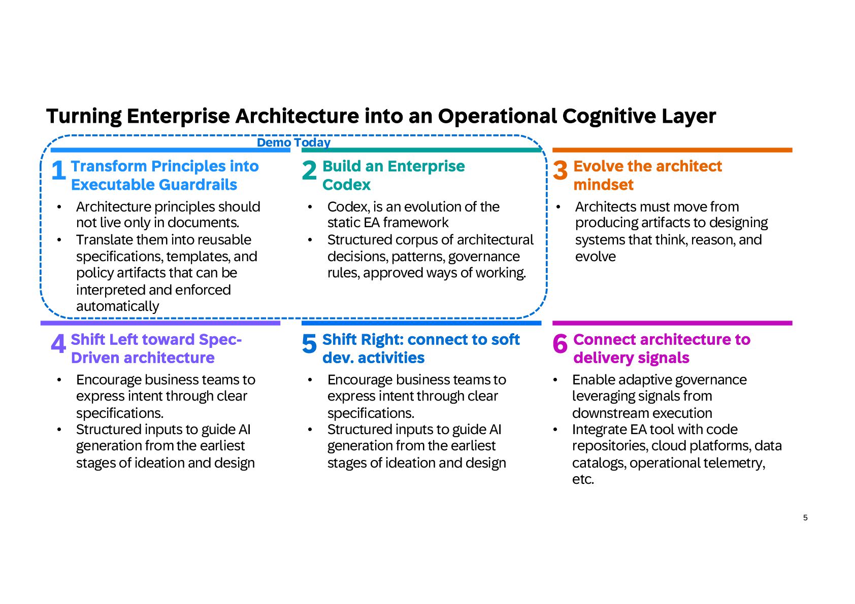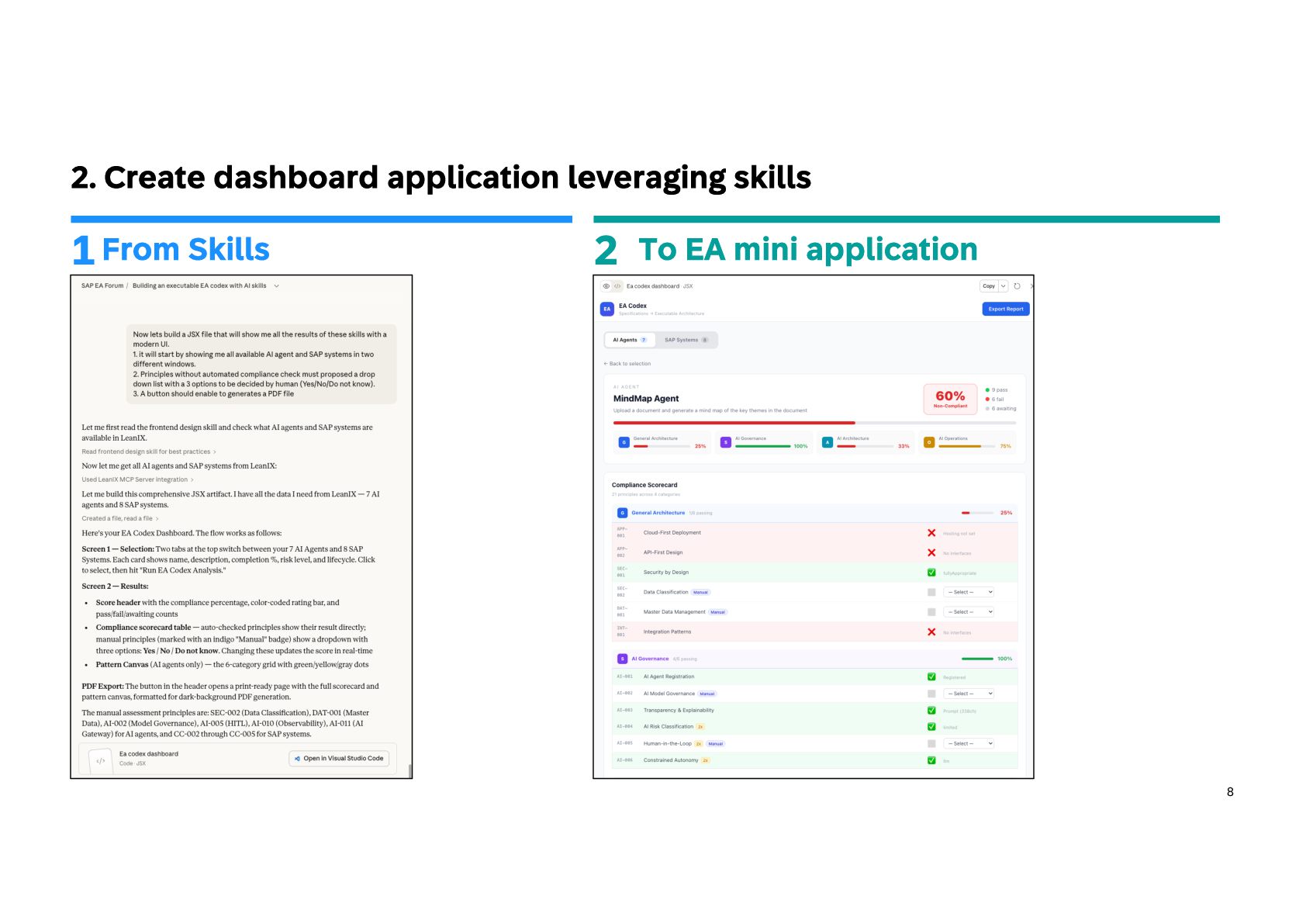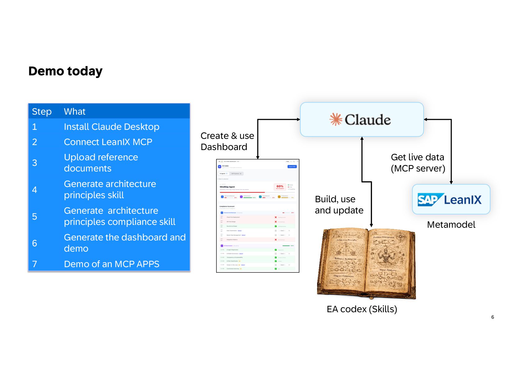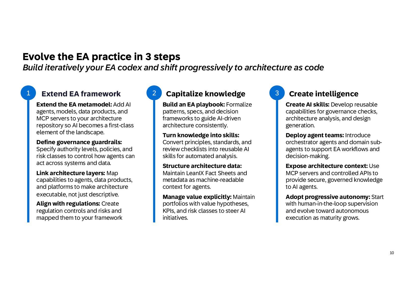 practice in 3 steps Build iteratively your EA codex and shift progressively to architecture as code Extend EA framework • Extend the EA metamodel: Add AI agents, models, data products, and MCP servers to your architecture repository so AI becomes a first-class element of the landscape. • Define governance guardrails: Specify authority levels, policies, and risk classes to control how agents can act across systems and data. • Link architecture layers: Map capabilities to agents, data products, and platforms to make architecture executable, not just descriptive. • Align with regulations: Create regulation controls and risks and mapped them to your framework 1 Capitalize knowledge • Build an EA playbook: Formalize patterns, specs, and decision frameworks to guide AI-driven architecture consistently. • Turn knowledge into skills: Convert principles, standards, and review checklists into reusable AI skills for automated analysis. • Structure architecture data: Maintain LeanIX Fact Sheets and metadata as machine-readable context for agents. • Manage value explicitly: Maintain portfolios with value hypotheses, KPIs, and risk classes to steer AI initiatives. 2 Create intelligence • Create AI skills: Develop reusable capabilities for governance checks, architecture analysis, and design generation. • Deploy agent teams: Introduce orchestrator agents and domain sub- agents to support EA workflows and decision-making. • Expose architecture context: Use MCP servers and controlled APIs to provide secure, governed knowledge to AI agents. • Adopt progressive autonomy: Start with human-in-the-loop supervision and evolve toward autonomous execution as maturity grows. 3