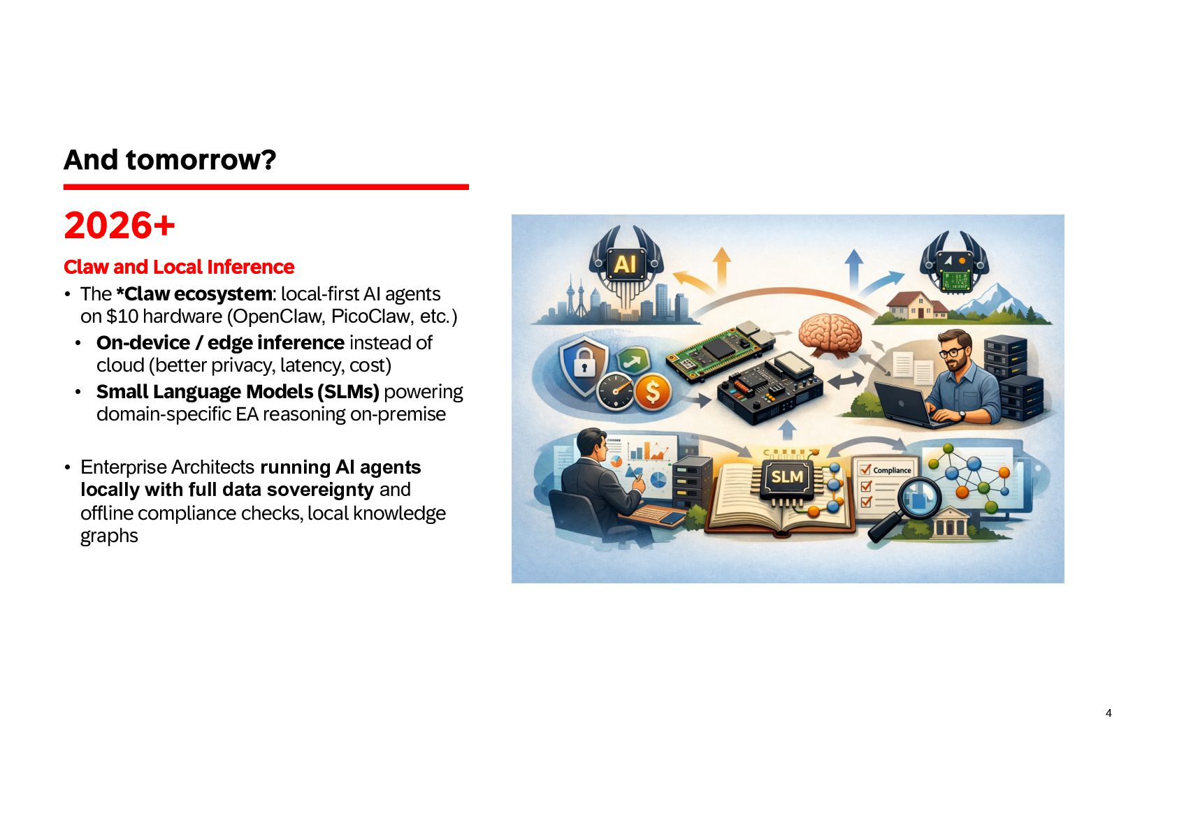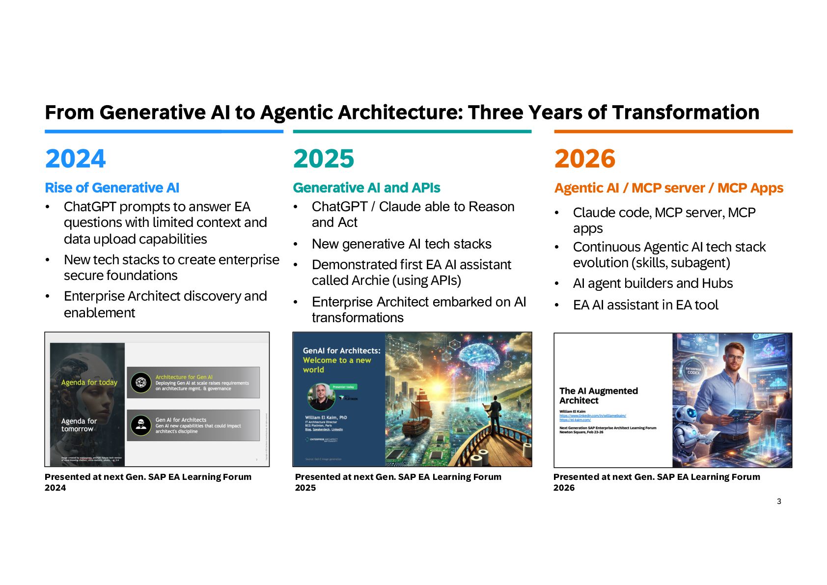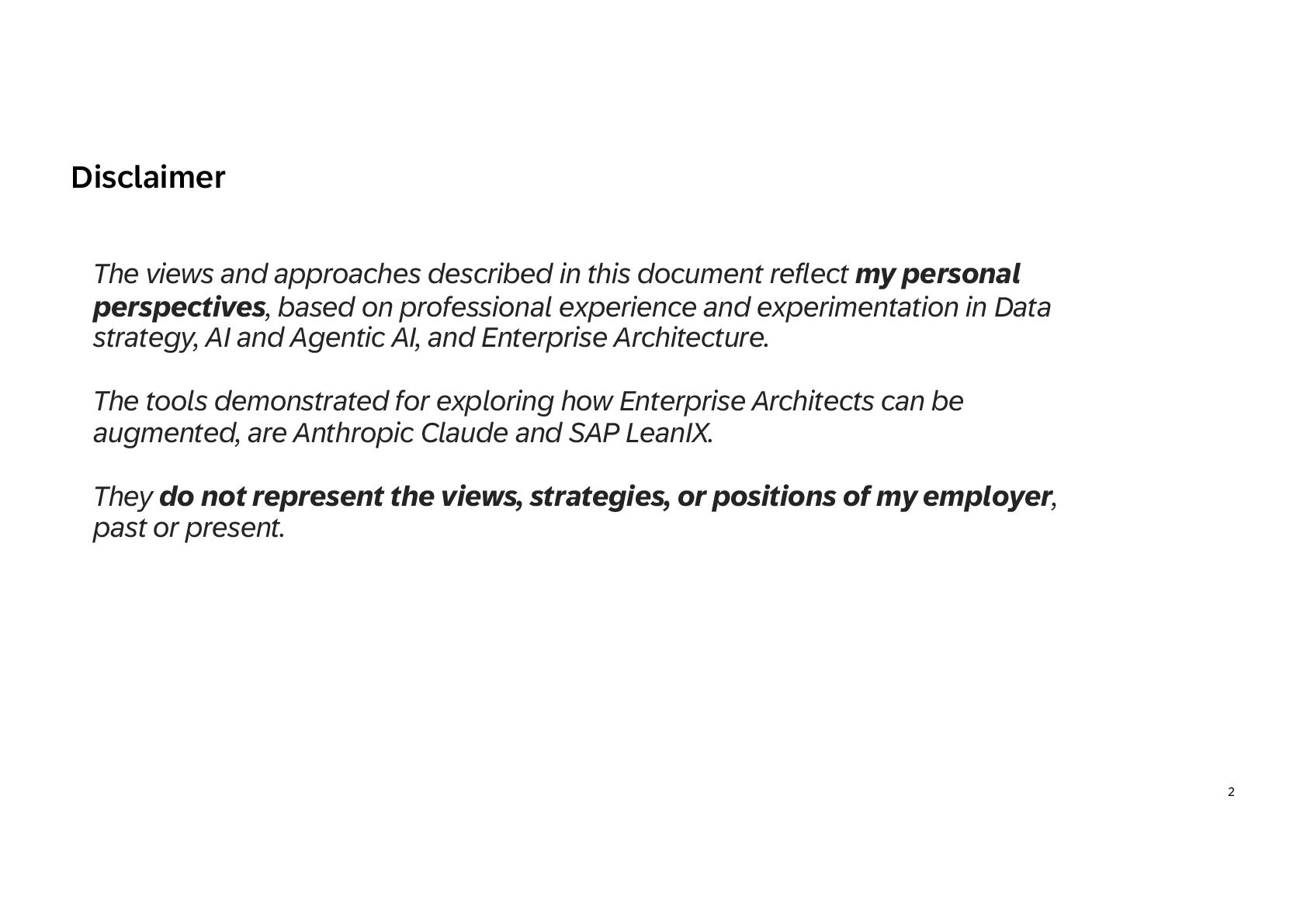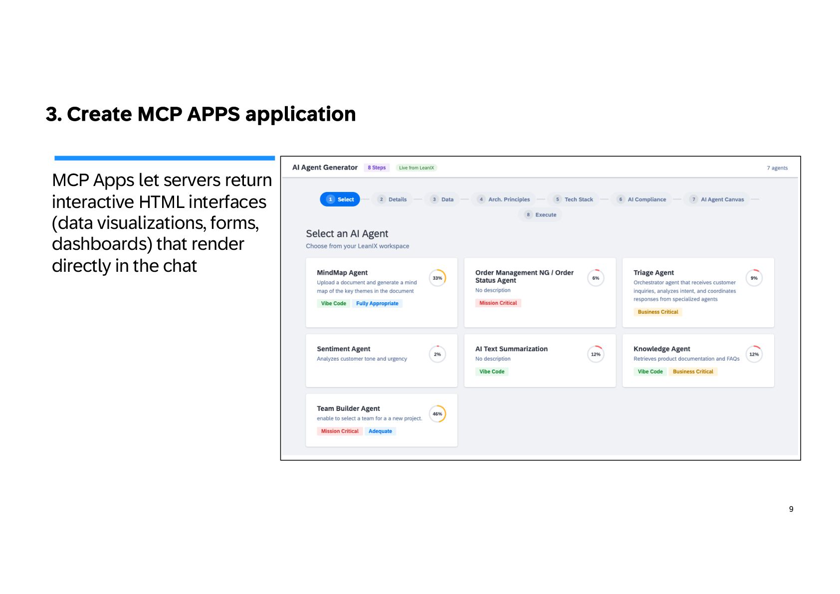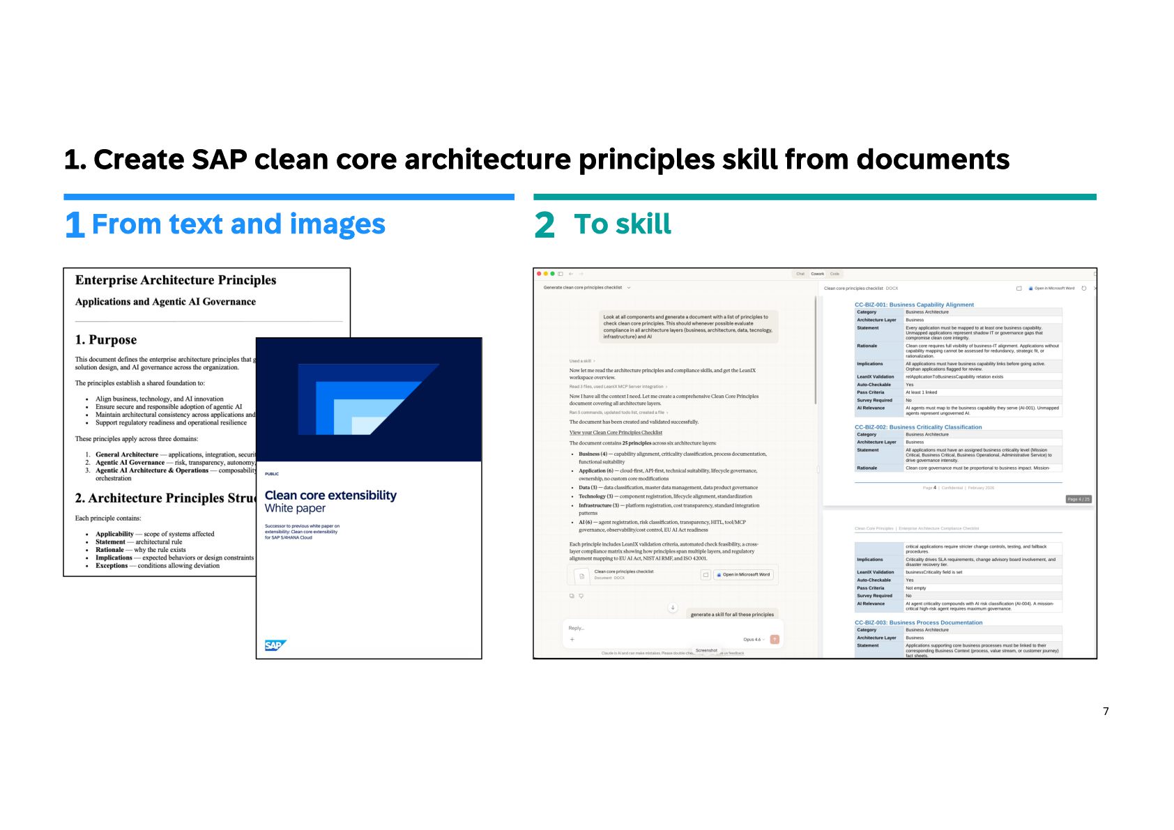 practice in 3 steps Build iteratively your EA codex and shift progressively to architecture as code Extend EA framework • Extend the EA metamodel: Add AI agents, models, data products, and MCP servers to your architecture repository so AI becomes a first-class element of the landscape. • Define governance guardrails: Specify authority levels, policies, and risk classes to control how agents can act across systems and data. • Link architecture layers: Map capabilities to agents, data products, and platforms to make architecture executable, not just descriptive. • Align with regulations: Create regulation controls and risks and mapped them to your framework 1 Capitalize knowledge • Build an EA playbook: Formalize patterns, specs, and decision frameworks to guide AI-driven architecture consistently. • Turn knowledge into skills: Convert principles, standards, and review checklists into reusable AI skills for automated analysis. • Structure architecture data: Maintain LeanIX Fact Sheets and metadata as machine-readable context for agents. • Manage value explicitly: Maintain portfolios with value hypotheses, KPIs, and risk classes to steer AI initiatives. 2 Create intelligence • Create AI skills: Develop reusable capabilities for governance checks, architecture analysis, and design generation. • Deploy agent teams: Introduce orchestrator agents and domain sub- agents to support EA workflows and decision-making. • Expose architecture context: Use MCP servers and controlled APIs to provide secure, governed knowledge to AI agents. • Adopt progressive autonomy: Start with human-in-the-loop supervision and evolve toward autonomous execution as maturity grows. 3