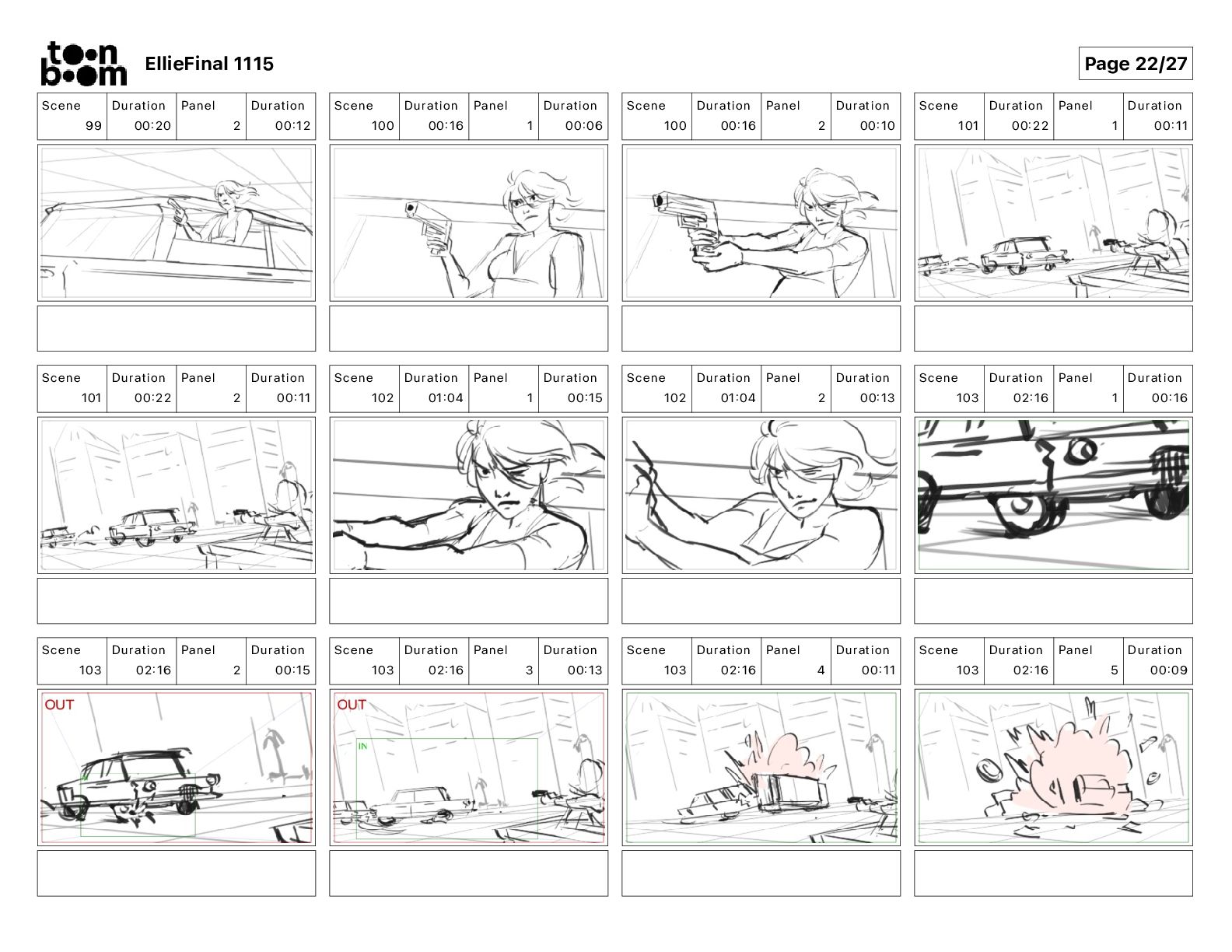 Scene 100 Duration 00 16 Panel 1 Duration 00 06 Scene 100 Duration 00 16 Panel 2 Duration 00 10 Scene 101 Duration 00 22 Panel 1 Duration 00 11 Scene 101 Duration 00 22 Panel 2 Duration 00 11 Scene 102 Duration 01 04 Panel 1 Duration 00 15 Scene 102 Duration 01 04 Panel 2 Duration 00 13 Scene 103 Duration 02 16 Panel 1 Duration 00 16 Scene 103 Duration 02 16 Panel 2 Duration 00 15 Scene 103 Duration 02 16 Panel 3 Duration 00 13 Scene 103 Duration 02 16 Panel 4 Duration 00 11 Scene 103 Duration 02 16 Panel 5 Duration 00 09 EllieFinal 1115 Page 22/27